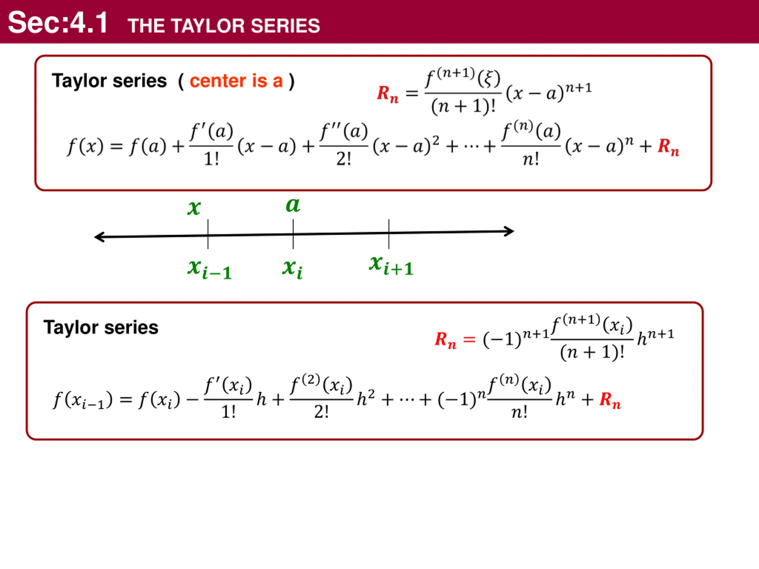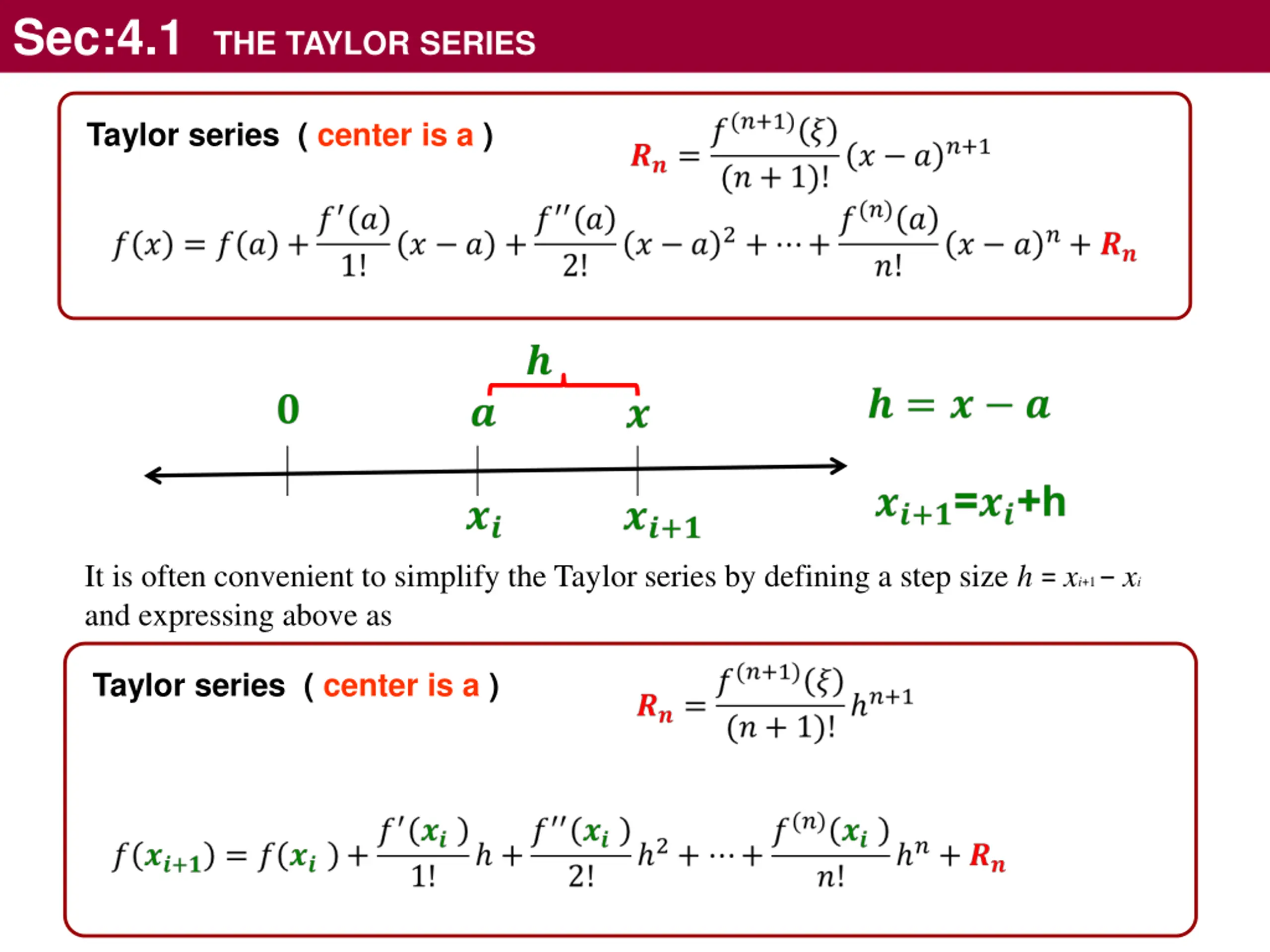 Sec:4.1 THE TAYLOR SERIES Taylor series ( center is a ) It is often convenient to simplify the Taylor series by defining a step size h = xi+1 xi and expressing above as Taylor series ( center is a )