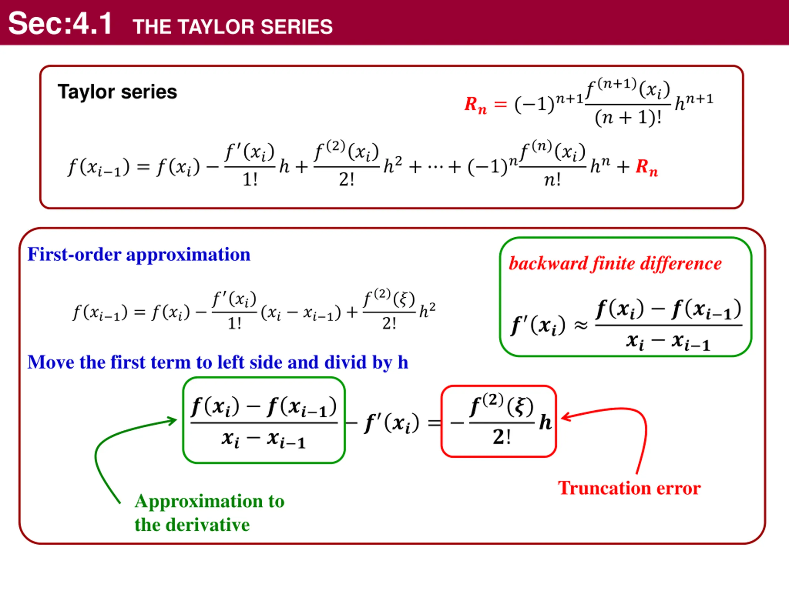 Sec:4.1 THE TAYLOR SERIES ??= ( 1)?+1??+1?? Taylor series ?+1 (? + 1)! ? ?? 1 = ? ?? ? ?? +?2?? 2+ + ( 1)????? ?+ ?? 1! 2! ?! First-order approximation backward finite difference ? ?? 1 = ? ?? ? ?? (?? ?? 1) +?2(?) ? ?? ? ?? ? ?? ? 2 1! 2! ?? ?? ? Move the first term to left side and divid by h ? ?? = ??(?) ? ?? ? ?? ? ?? ?? ? ? ?! Truncation error Approximation to the derivative