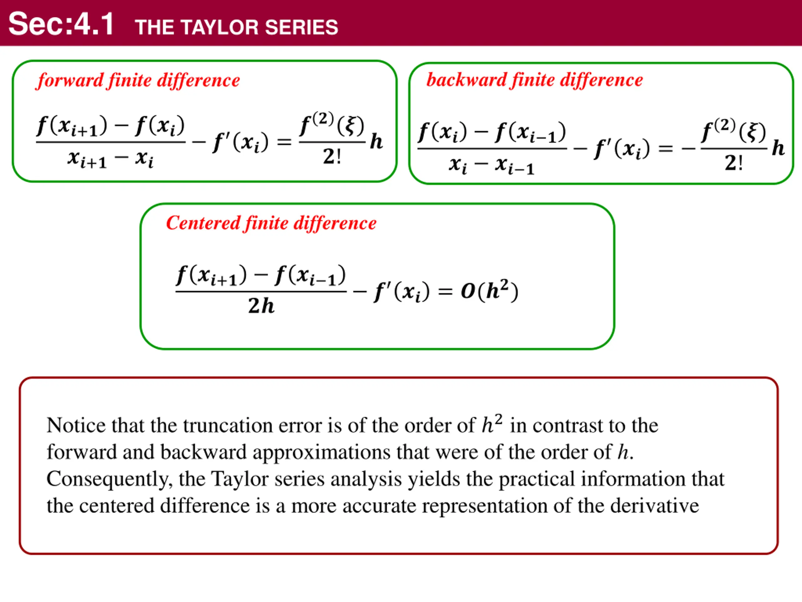 Sec:4.1 THE TAYLOR SERIES backward finite difference forward finite difference ? ?? =??(?) ? ??+? ? ?? ??+? ?? ? ?? = ??(?) ? ?? ? ?? ? ?? ?? ? ? ? ?! ?! Centered finite difference ? ??+? ? ?? ? ?? ? ?? = ?(??) Notice that the truncation error is of the order of 2in contrast to the forward and backward approximations that were of the order of h. Consequently, the Taylor series analysis yields the practical information that the centered difference is a more accurate representation of the derivative