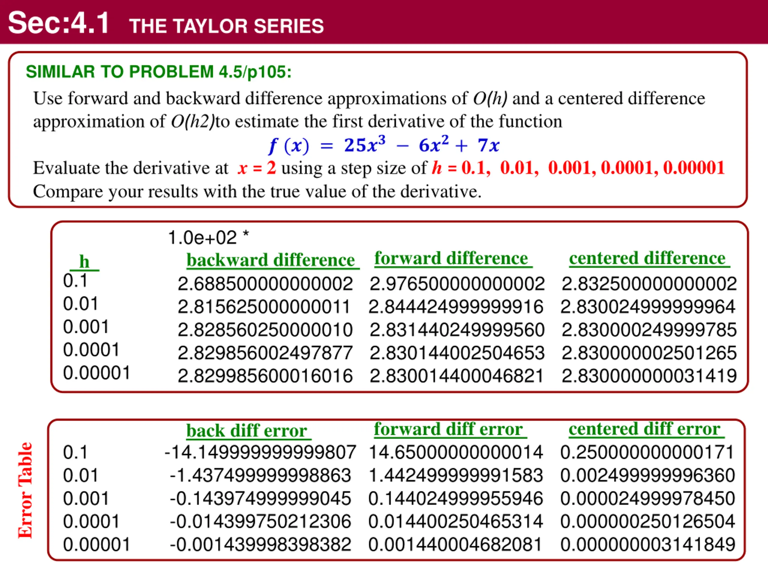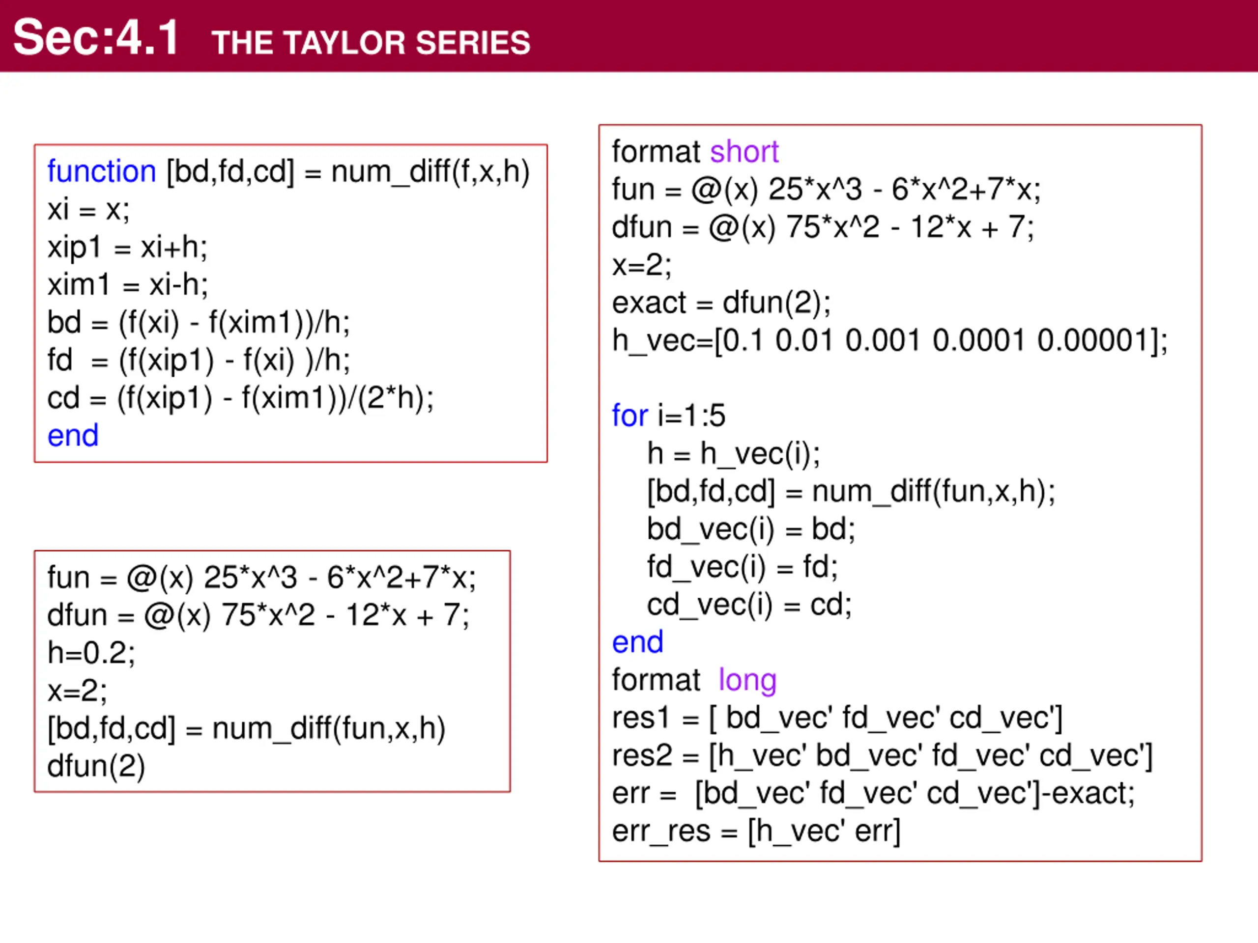 Sec:4.1 THE TAYLOR SERIES format short fun = @(x) 25*x^3 - 6*x^2+7*x; dfun = @(x) 75*x^2 - 12*x + 7; x=2; exact = dfun(2); h_vec=[0.1 0.01 0.001 0.0001 0.00001]; function [bd,fd,cd] = num_diff(f,x,h) xi = x; xip1 = xi+h; xim1 = xi-h; bd = (f(xi) - f(xim1))/h; fd = (f(xip1) - f(xi) )/h; cd = (f(xip1) - f(xim1))/(2*h); end for i=1:5 h = h_vec(i); [bd,fd,cd] = num_diff(fun,x,h); bd_vec(i) = bd; fd_vec(i) = fd; cd_vec(i) = cd; end format long res1 = [ bd_vec' fd_vec' cd_vec'] res2 = [h_vec' bd_vec' fd_vec' cd_vec'] err = [bd_vec' fd_vec' cd_vec']-exact; err_res = [h_vec' err] fun = @(x) 25*x^3 - 6*x^2+7*x; dfun = @(x) 75*x^2 - 12*x + 7; h=0.2; x=2; [bd,fd,cd] = num_diff(fun,x,h) dfun(2)