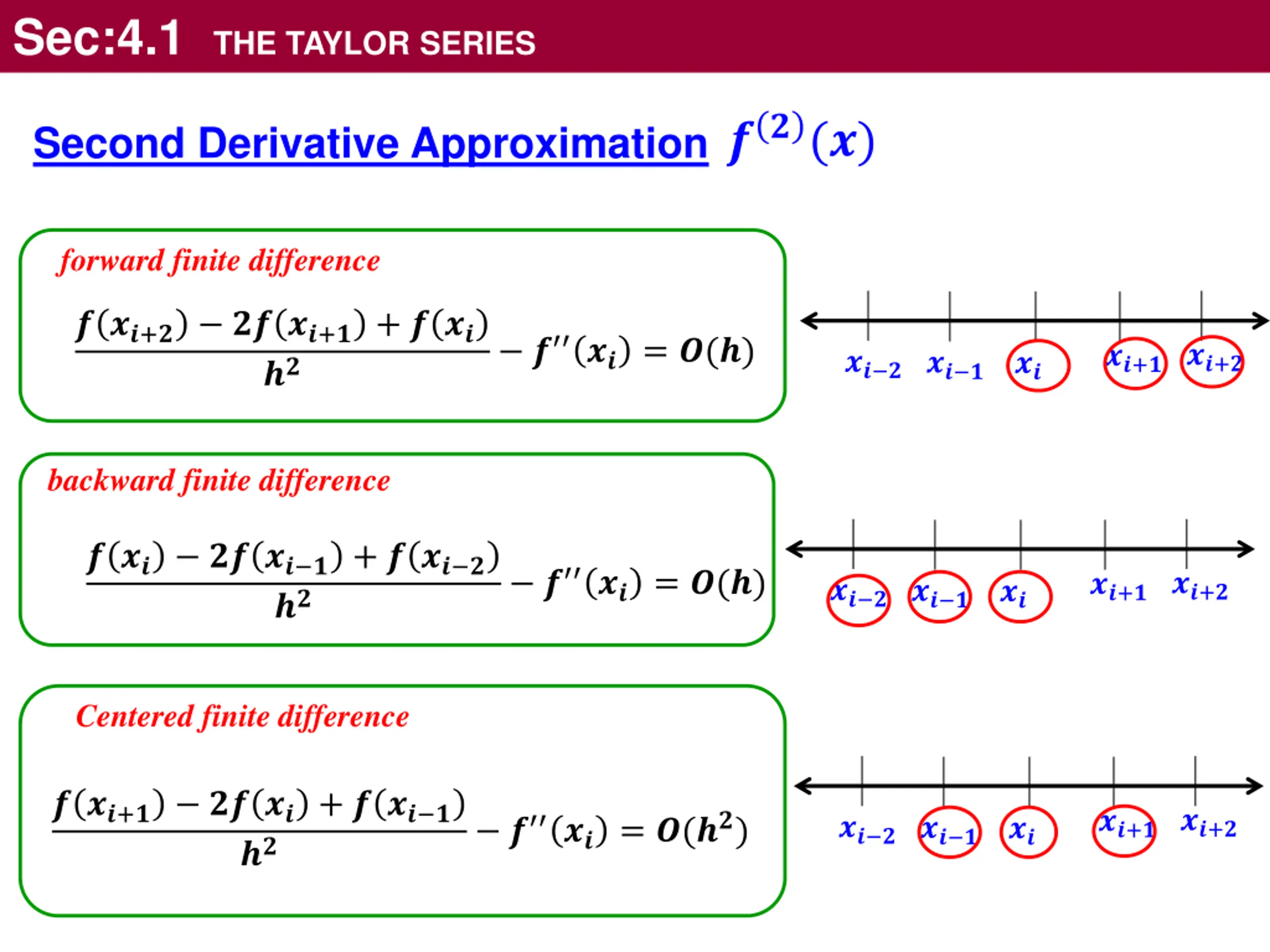 Sec:4.1 THE TAYLOR SERIES Second Derivative Approximation ??(?) forward finite difference ? ??+? ?? ??+? + ? ?? ?? ? ?? = ?(?) ??+? ??+? ?? ? ?? ? ?? backward finite difference ? ?? ?? ?? ? + ? ?? ? ?? ? ?? = ?(?) ??+? ??+? ?? ? ?? ? ?? Centered finite difference ? ??+? ?? ?? + ? ?? ? ?? ??+? ??+? ? ?? = ?(??) ?? ? ?? ? ??