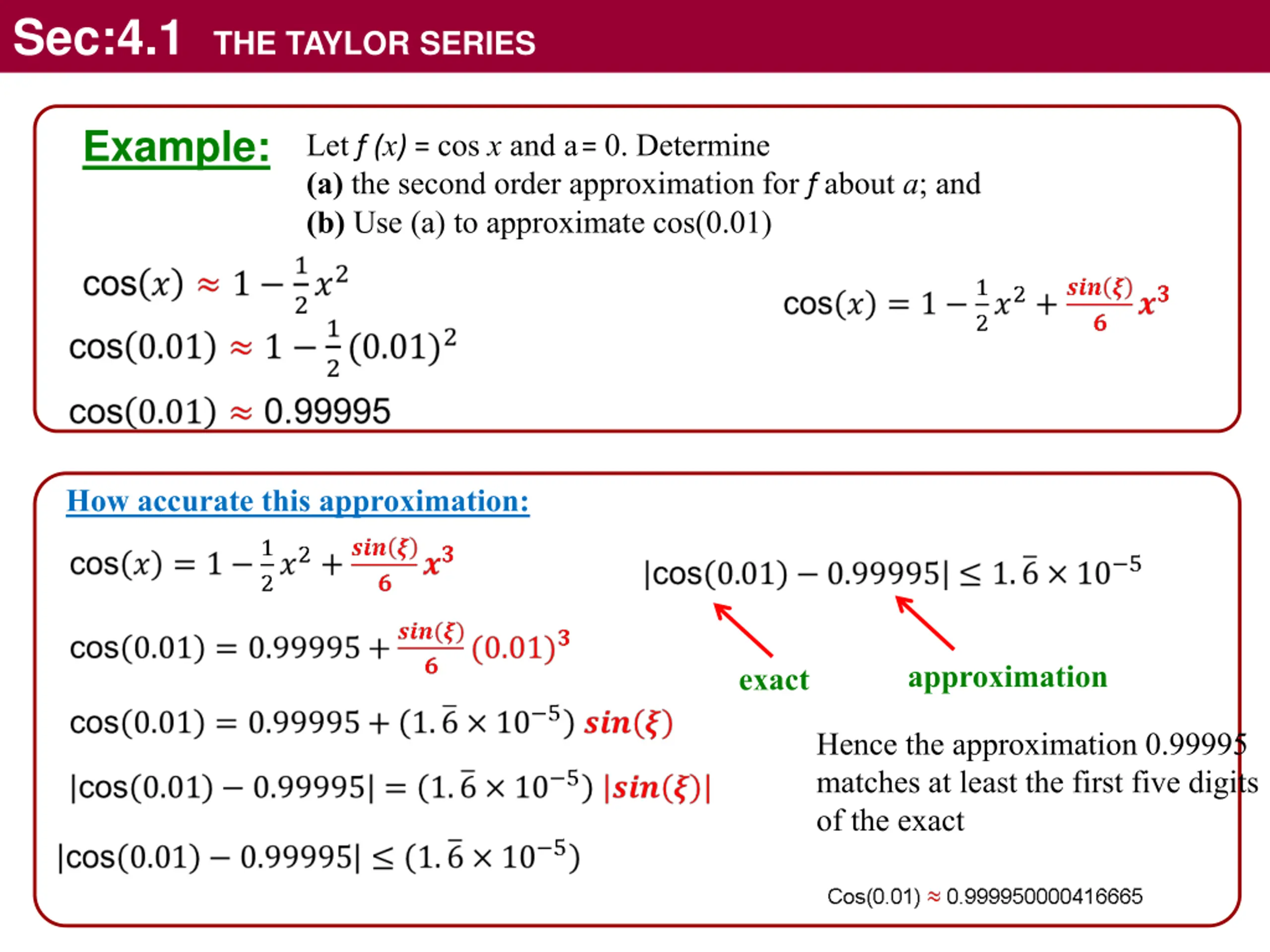 Sec:4.1 THE TAYLOR SERIES Example: Let f (x) = cos x and a= 0. Determine (a) the second order approximation for f about a; and (b) Use (a) to approximate cos(0.01) How accurate this approximation: approximation exact Hence the approximation 0.99995 matches at least the first five digits of the exact