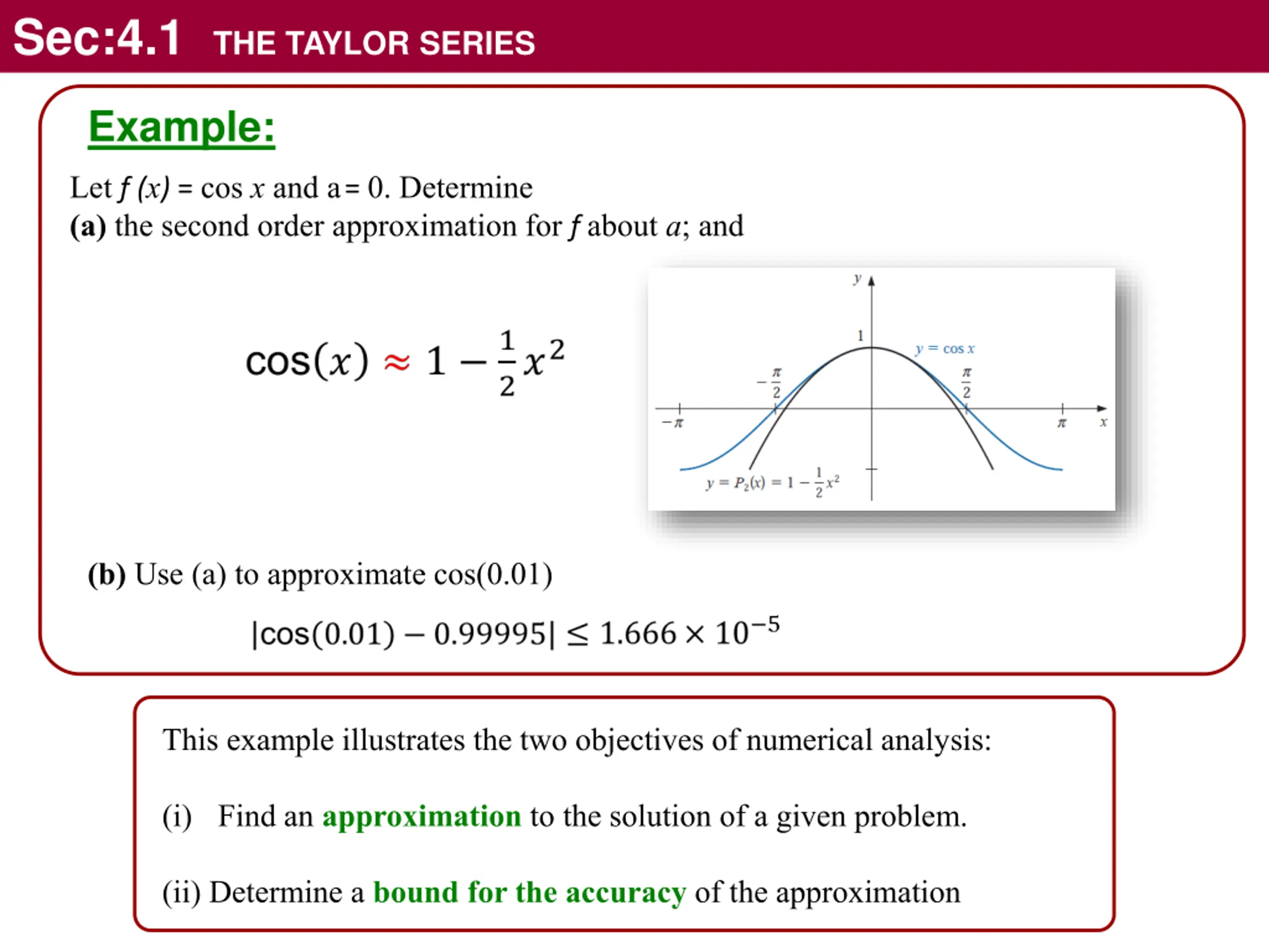 Sec:4.1 THE TAYLOR SERIES Example: Let f (x) = cos x and a= 0. Determine (a) the second order approximation for f about a; and (b) Use (a) to approximate cos(0.01) This example illustrates the two objectives of numerical analysis: (i) Find an approximation to the solution of a given problem. (ii) Determine a bound for the accuracy of the approximation