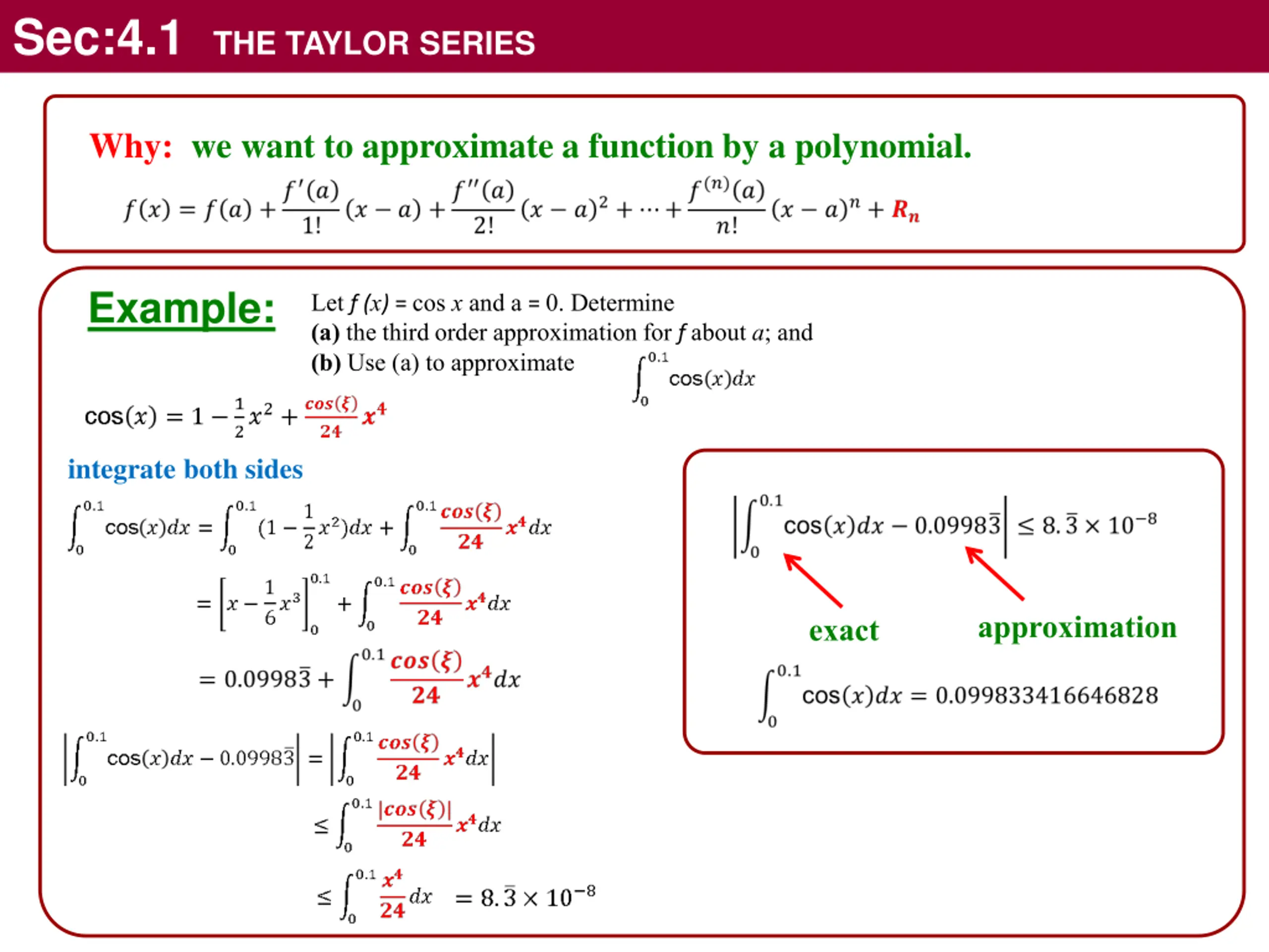 Sec:4.1 THE TAYLOR SERIES Why: we want to approximate a function by a polynomial. Example: Let f (x) = cos x and a = 0. Determine (a) the third order approximation for f about a; and (b) Use (a) to approximate integrate both sides approximation exact