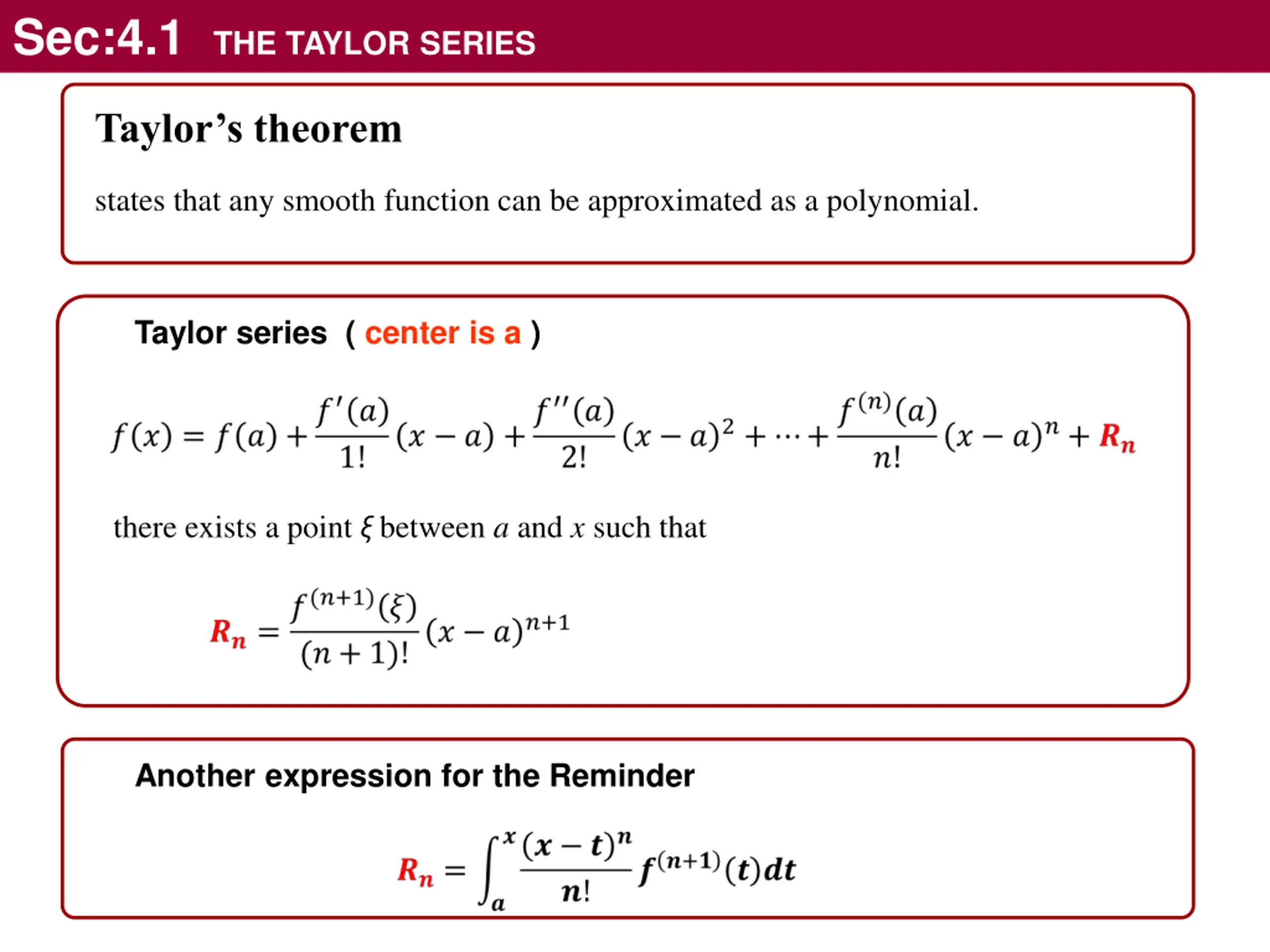 Sec:4.1 THE TAYLOR SERIES Taylor s theorem states that any smooth function can be approximated as a polynomial. Taylor series ( center is a ) there exists a point between a and x such that Another expression for the Reminder