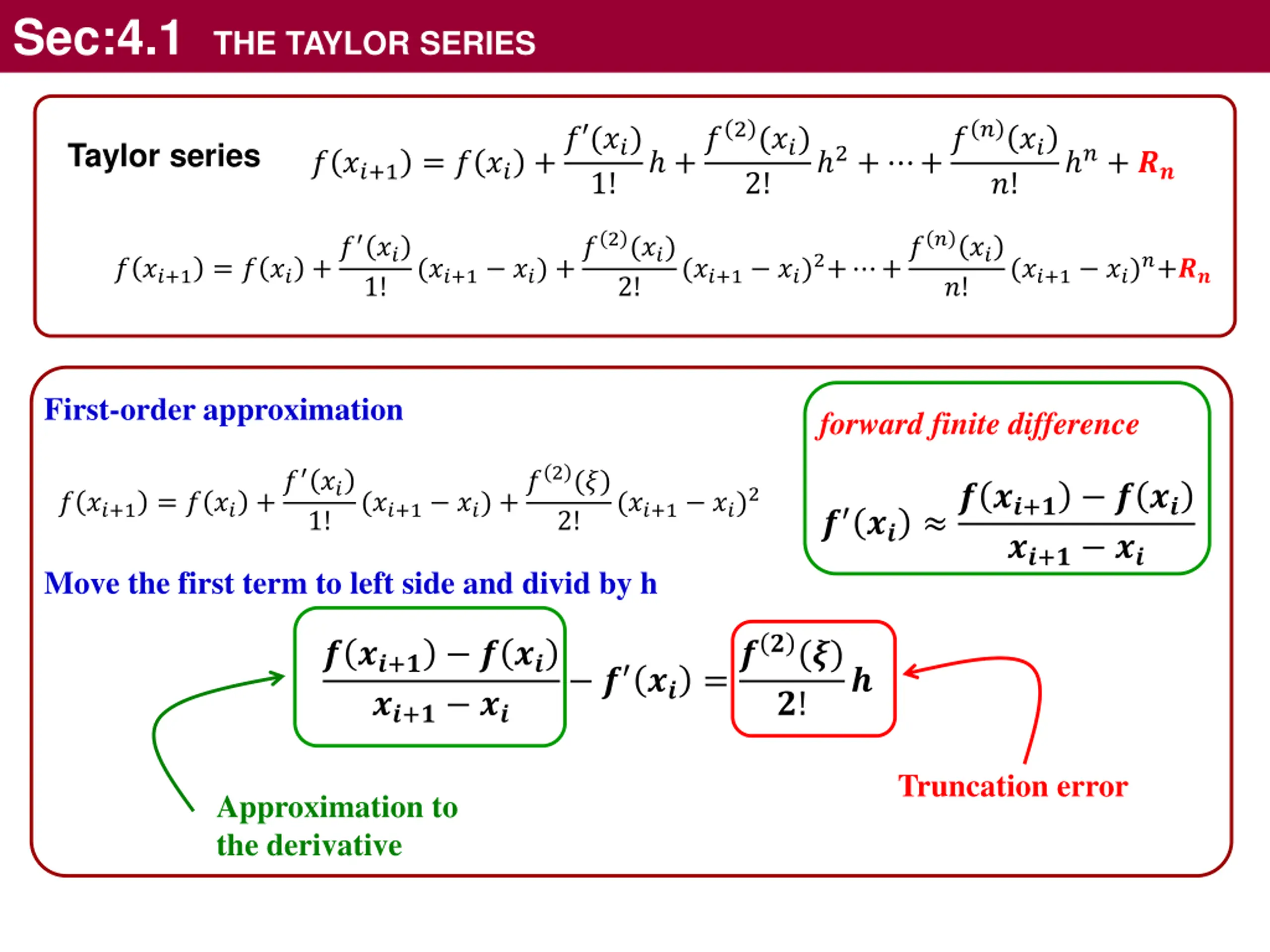 Sec:4.1 THE TAYLOR SERIES +?2(??) 2+ +???? ? ??+1 = ? ?? +? (??) Taylor series ?+ ?? 1! 2! ?! ? ??+1 = ? ?? +? ?? (??+1 ??) +?2(??) (??+1 ??)2+ +???? (??+1 ??)?+?? 1! 2! ?! First-order approximation forward finite difference ? ??+1 = ? ?? +? ?? (??+1 ??) +?2(?) ? ?? ? ??+? ? ?? (??+1 ??)2 1! 2! ??+? ?? Move the first term to left side and divid by h ? ?? =??(?) ? ??+? ? ?? ??+? ?? ? ?! Truncation error Approximation to the derivative