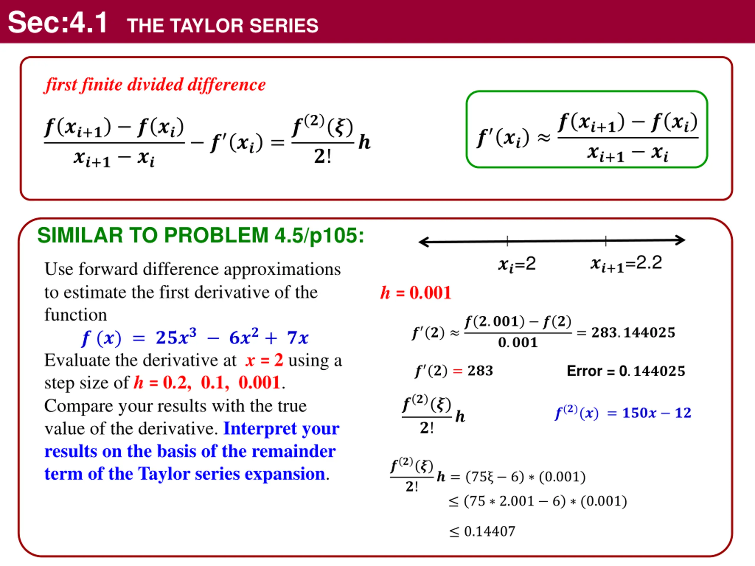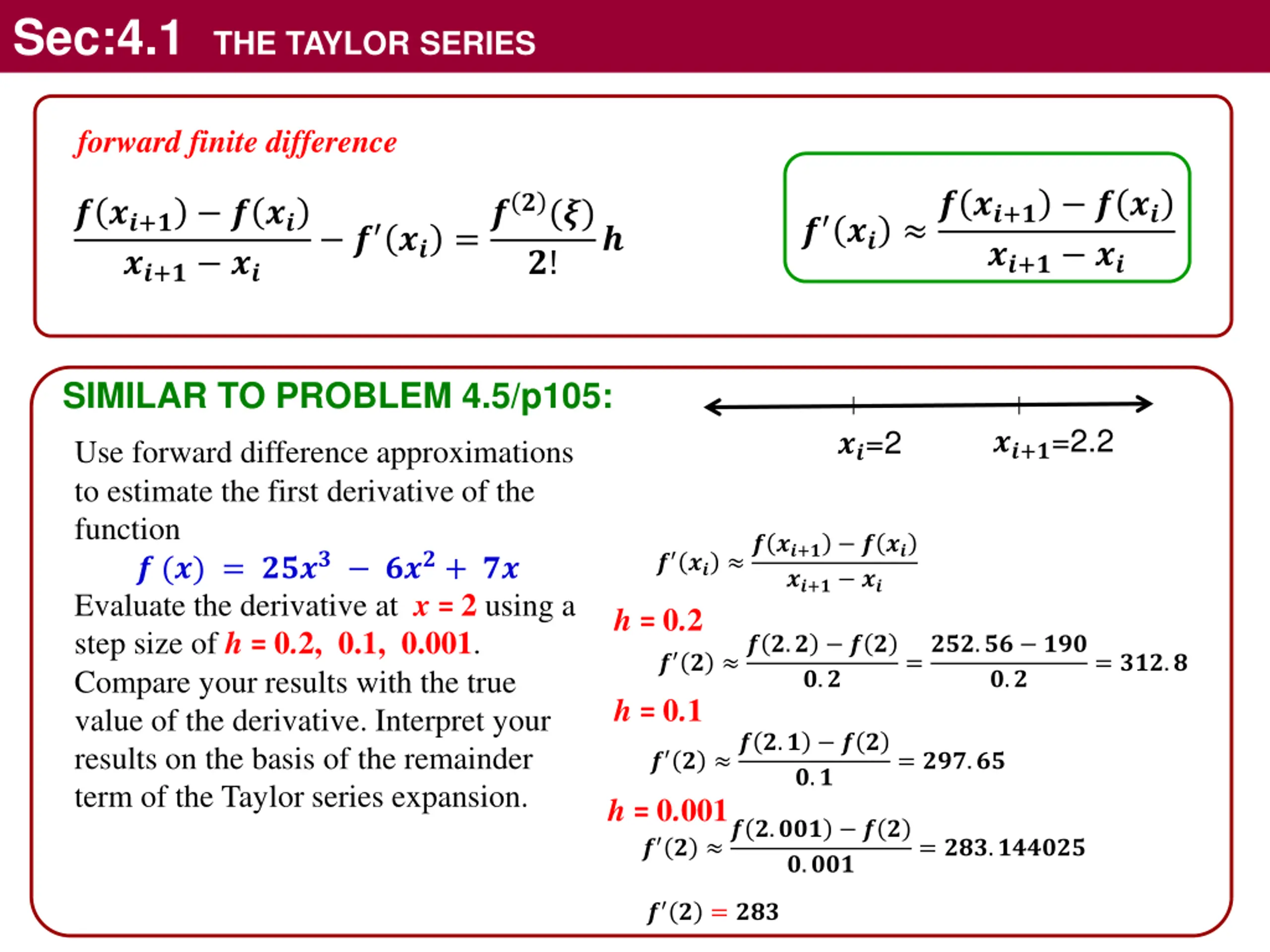 Sec:4.1 THE TAYLOR SERIES forward finite difference ? ?? ? ??+? ? ?? ? ?? =??(?) ? ??+? ? ?? ??+? ?? ? ??+? ?? ?! SIMILAR TO PROBLEM 4.5/p105: ??+?=2.2 ??=2 Use forward difference approximations to estimate the first derivative of the function ? (?) = ???? ???+ ?? Evaluate the derivative at x = 2 using a step size of h = 0.2, 0.1, 0.001. Compare your results with the true value of the derivative. Interpret your results on the basis of the remainder term of the Taylor series expansion. ? ?? ? ??+? ? ?? ??+? ?? h = 0.2 ? ? ? ?.? ? ? h = 0.1 =???.?? ??? ?.? = ???.? ?.? ? ? ? ?.? ? ? = ???.?? ?.? h = 0.001 ? ? ? ?.??? ? ? = ???.?????? ?.??? ? ? = ???