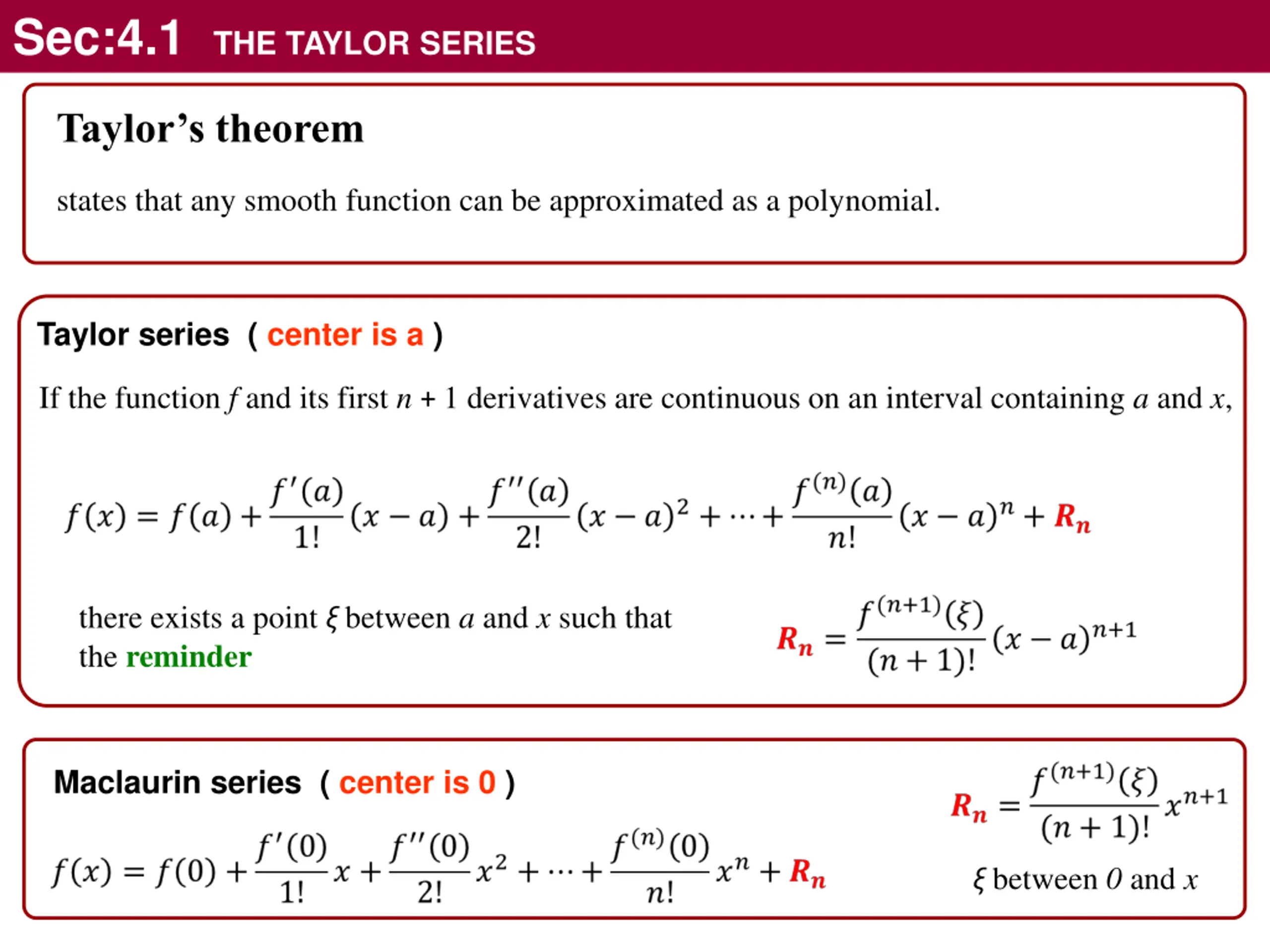 Sec:4.1 THE TAYLOR SERIES Taylor s theorem states that any smooth function can be approximated as a polynomial. Taylor series ( center is a ) If the function f and its first n + 1 derivatives are continuous on an interval containing a and x, there exists a point between a and x such that the reminder Maclaurin series ( center is 0 ) between 0 and x