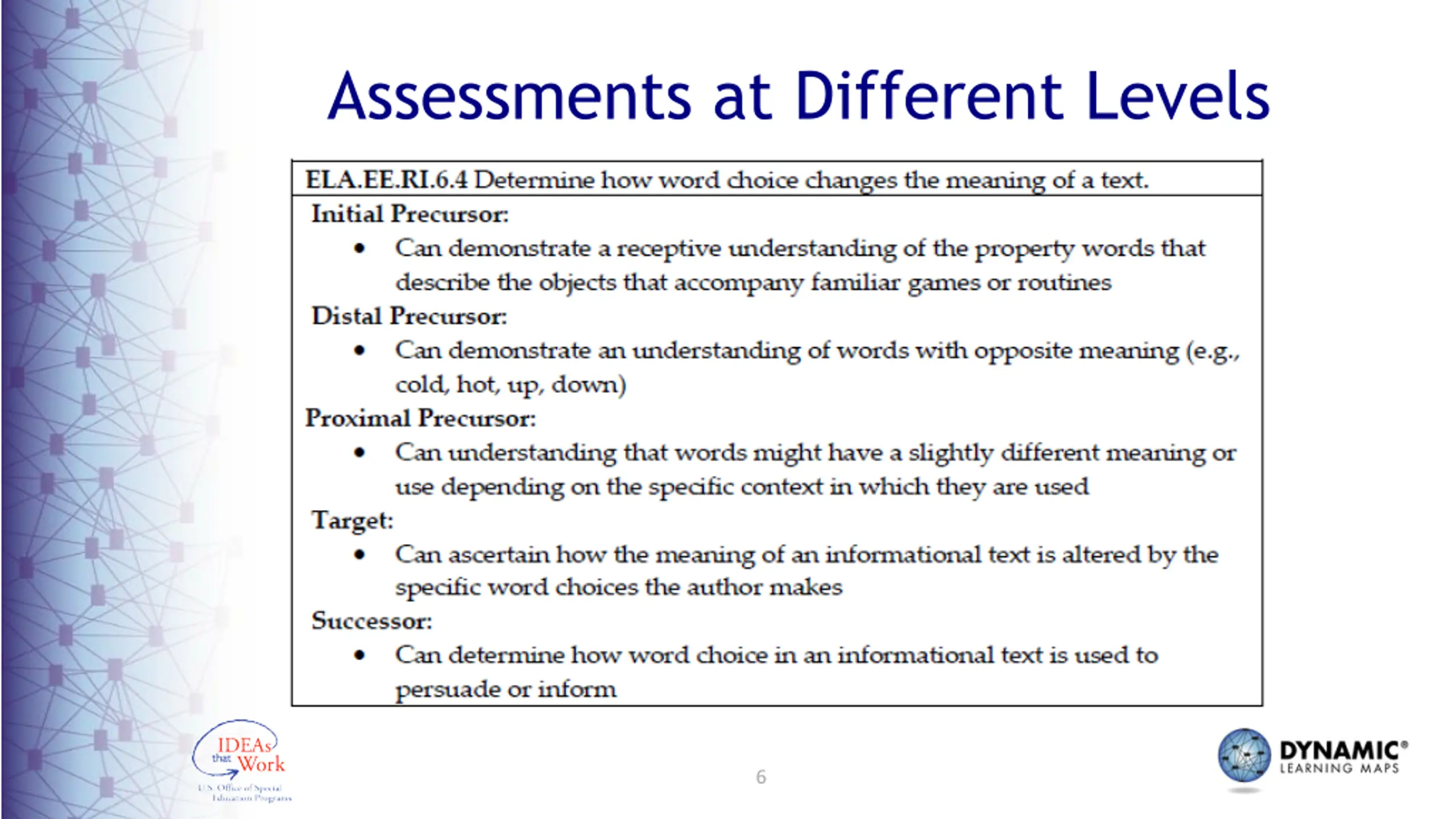 Creation of Instructional Plans Teachers create instructional plans using an online system They select the content standard and level at which they want to instruct and assess the student Alternate achievement standards are Essential Elements Assessments are available at five levels, known as linkage levels, for each content standard Initial Precursor Distal Precursor Proximal Precursor Target Successor 5