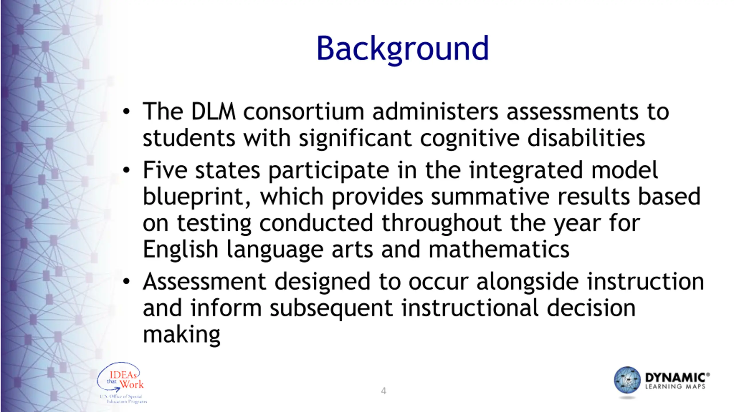 Background The DLM consortium administers assessments to students with significant cognitive disabilities Five states participate in the integrated model blueprint, which provides summative results based on testing conducted throughout the year for English language arts and mathematics Assessment designed to occur alongside instruction and inform subsequent instructional decision making 4