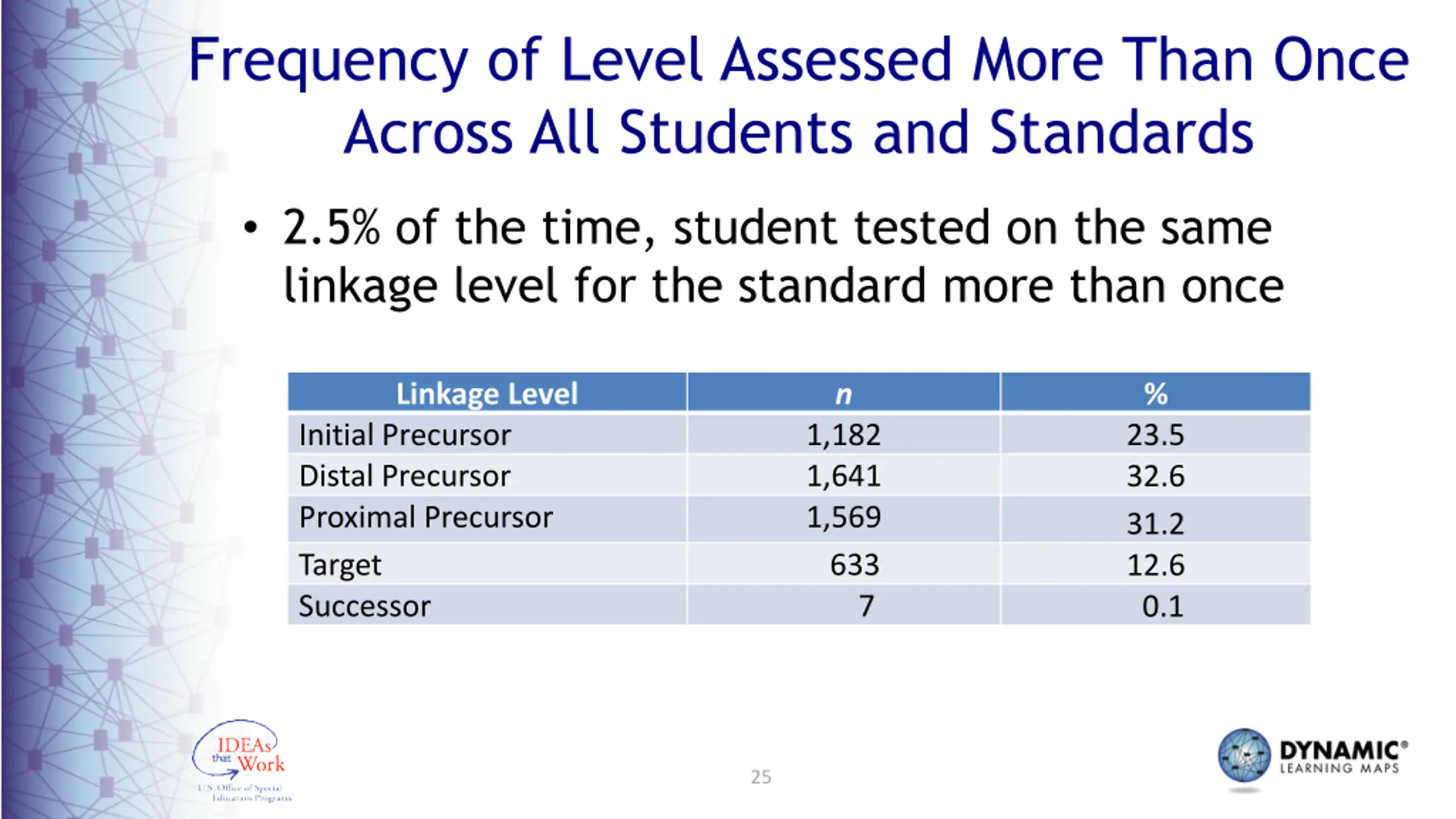 Testing on Multiple Linkage Levels in a Standard 2,604 (19.5%) tested on more than one linkage level within a standard Of students who assessed the same standard at more than one linkage level, most assessed at two different linkage levels (mean = 2.1, median = 2) However, in 23 instances across all students and standards (0.01%), the students tested on all five linkage levels within the standard 24