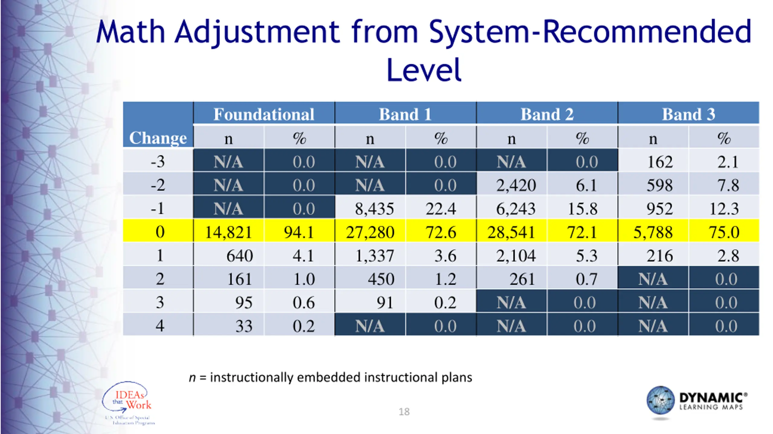 Math Adjustment from System-Recommended Level Foundational n N/A N/A N/A 14,821 640 161 95 33 Band 1 Band 2 Band 3 Change -3 -2 -1 0 1 2 3 4 % 0.0 0.0 0.0 94.1 4.1 1.0 0.6 0.2 n % 0.0 0.0 22.4 72.6 3.6 1.2 0.2 0.0 n % 0.0 6.1 15.8 72.1 5.3 0.7 0.0 0.0 n 162 598 952 5,788 216 N/A N/A N/A % 2.1 7.8 12.3 75.0 2.8 0.0 0.0 0.0 N/A N/A 8,435 27,280 1,337 450 N/A 2,420 6,243 28,541 2,104 261 N/A N/A 91 N/A n = instructionally embedded instructional plans 18