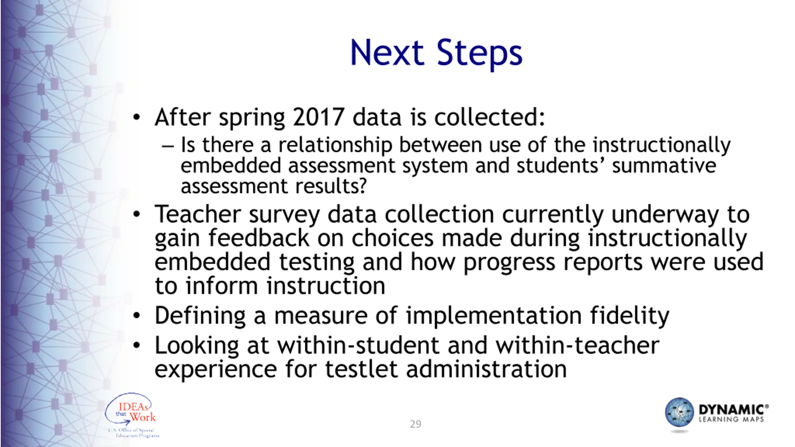 Next Steps After spring 2017 data is collected: Is there a relationship between use of the instructionally embedded assessment system and students summative assessment results? Teacher survey data collection currently underway to gain feedback on choices made during instructionally embedded testing and how progress reports were used to inform instruction Defining a measure of implementation fidelity Looking at within-student and within-teacher experience for testlet administration 29
