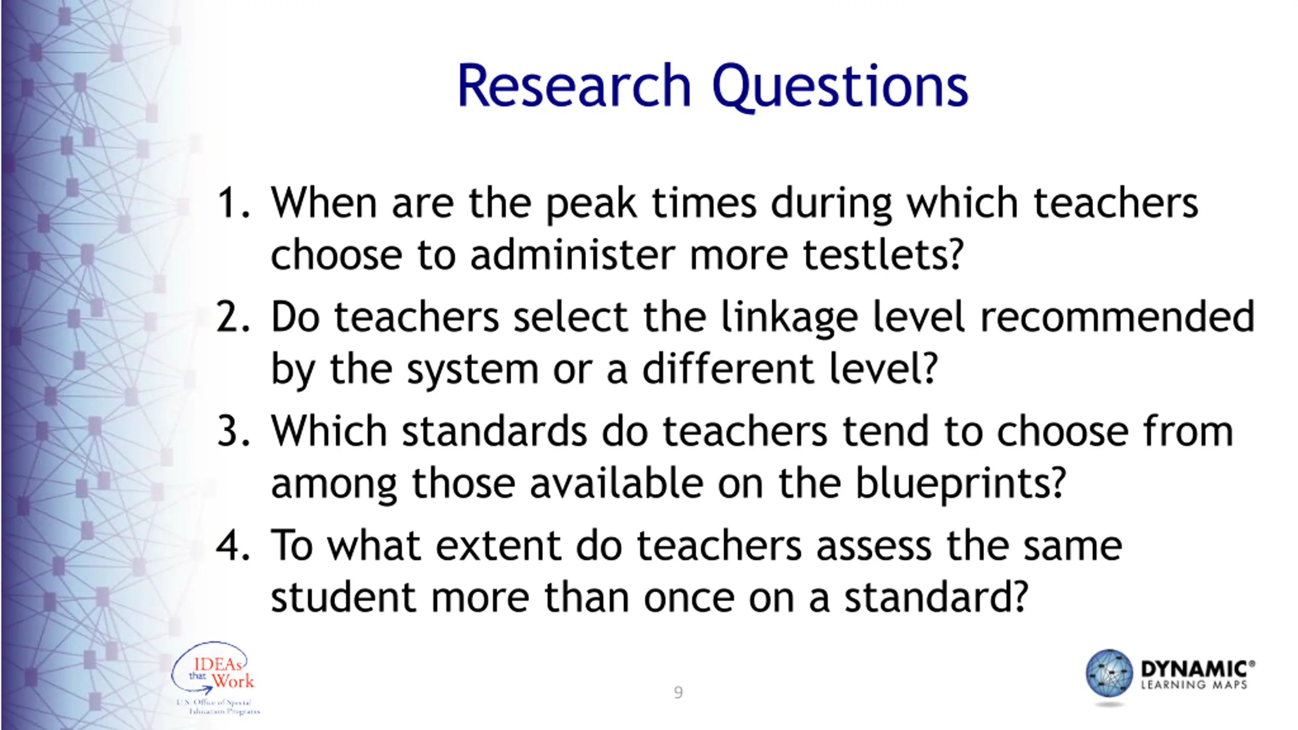 Research Questions 1. When are the peak times during which teachers choose to administer more testlets? 2. Do teachers select the linkage level recommended by the system or a different level? 3. Which standards do teachers tend to choose from among those available on the blueprints? 4. To what extent do teachers assess the same student more than once on a standard? 9