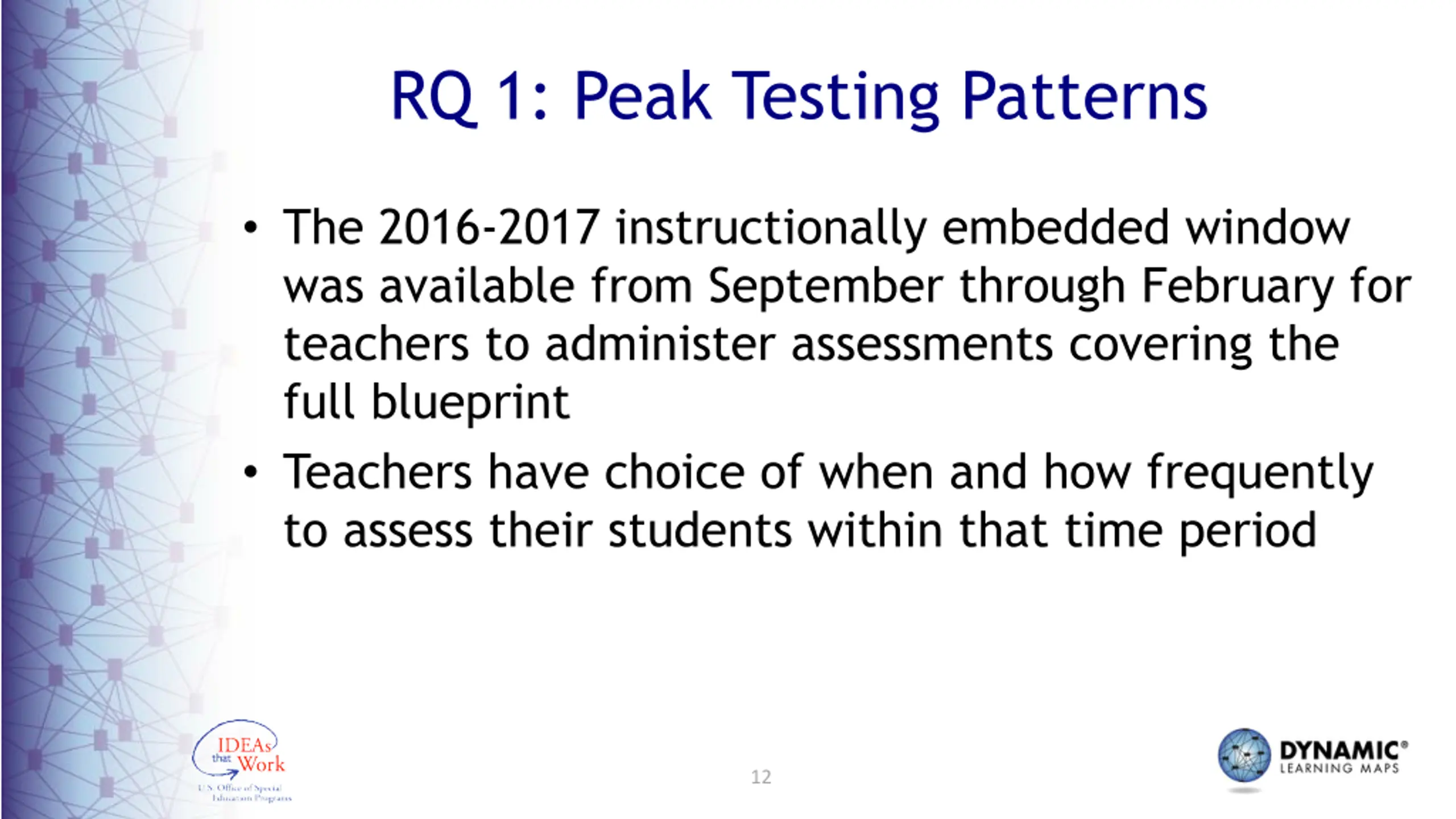 RQ 1: Peak Testing Patterns The 2016-2017 instructionally embedded window was available from September through February for teachers to administer assessments covering the full blueprint Teachers have choice of when and how frequently to assess their students within that time period 12