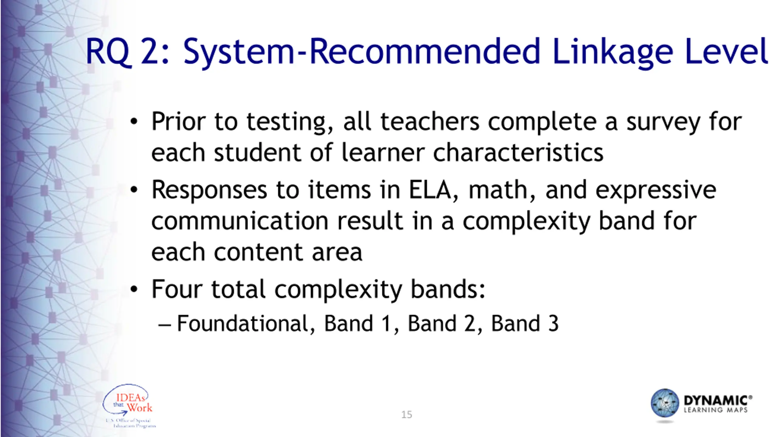 RQ 2: System-Recommended Linkage Level Prior to testing, all teachers complete a survey for each student of learner characteristics Responses to items in ELA, math, and expressive communication result in a complexity band for each content area Four total complexity bands: Foundational, Band 1, Band 2, Band 3 15