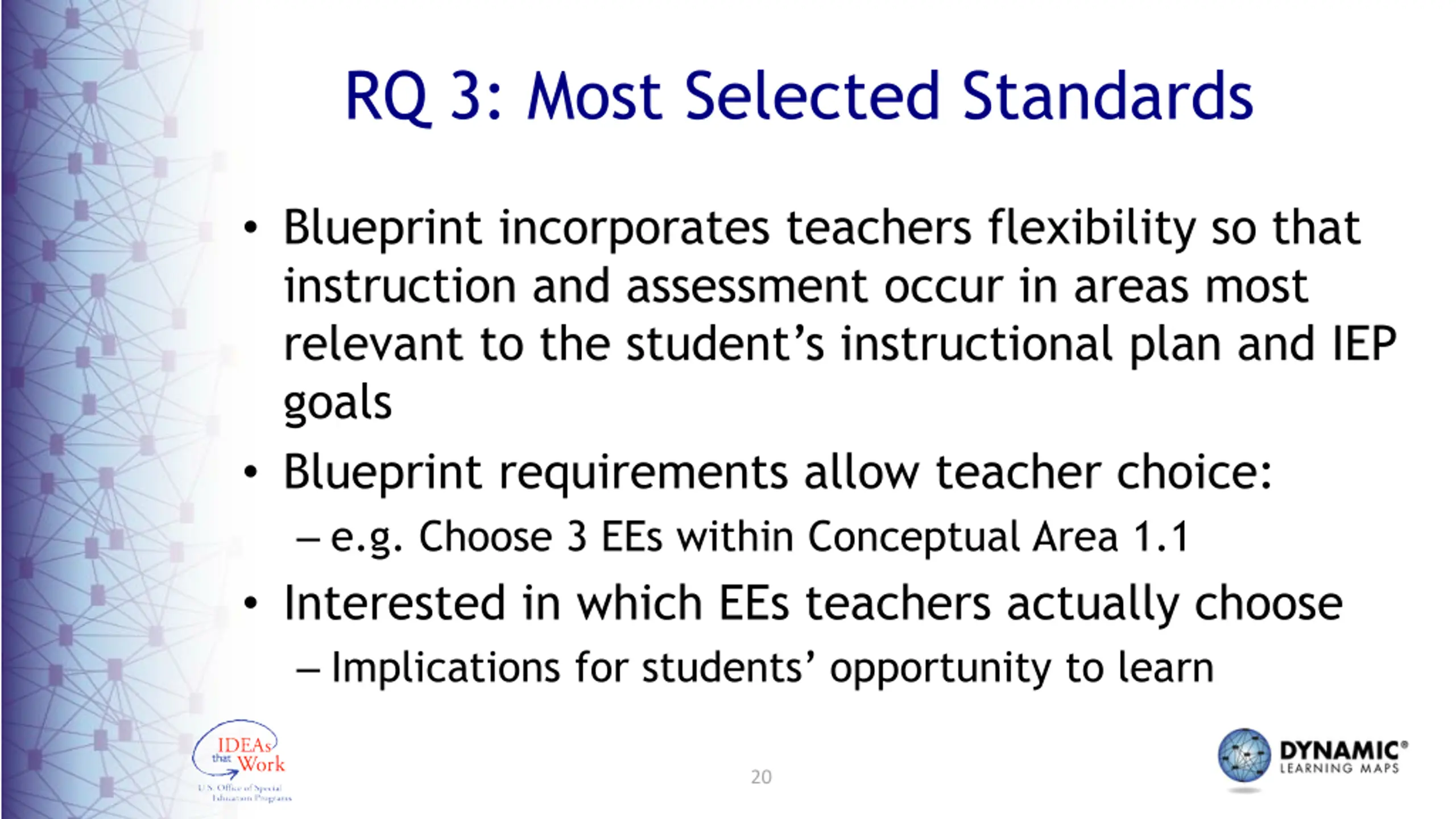 RQ 3: Most Selected Standards Blueprint incorporates teachers flexibility so that instruction and assessment occur in areas most relevant to the student s instructional plan and IEP goals Blueprint requirements allow teacher choice: e.g. Choose 3 EEs within Conceptual Area 1.1 Interested in which EEs teachers actually choose Implications for students opportunity to learn 20
