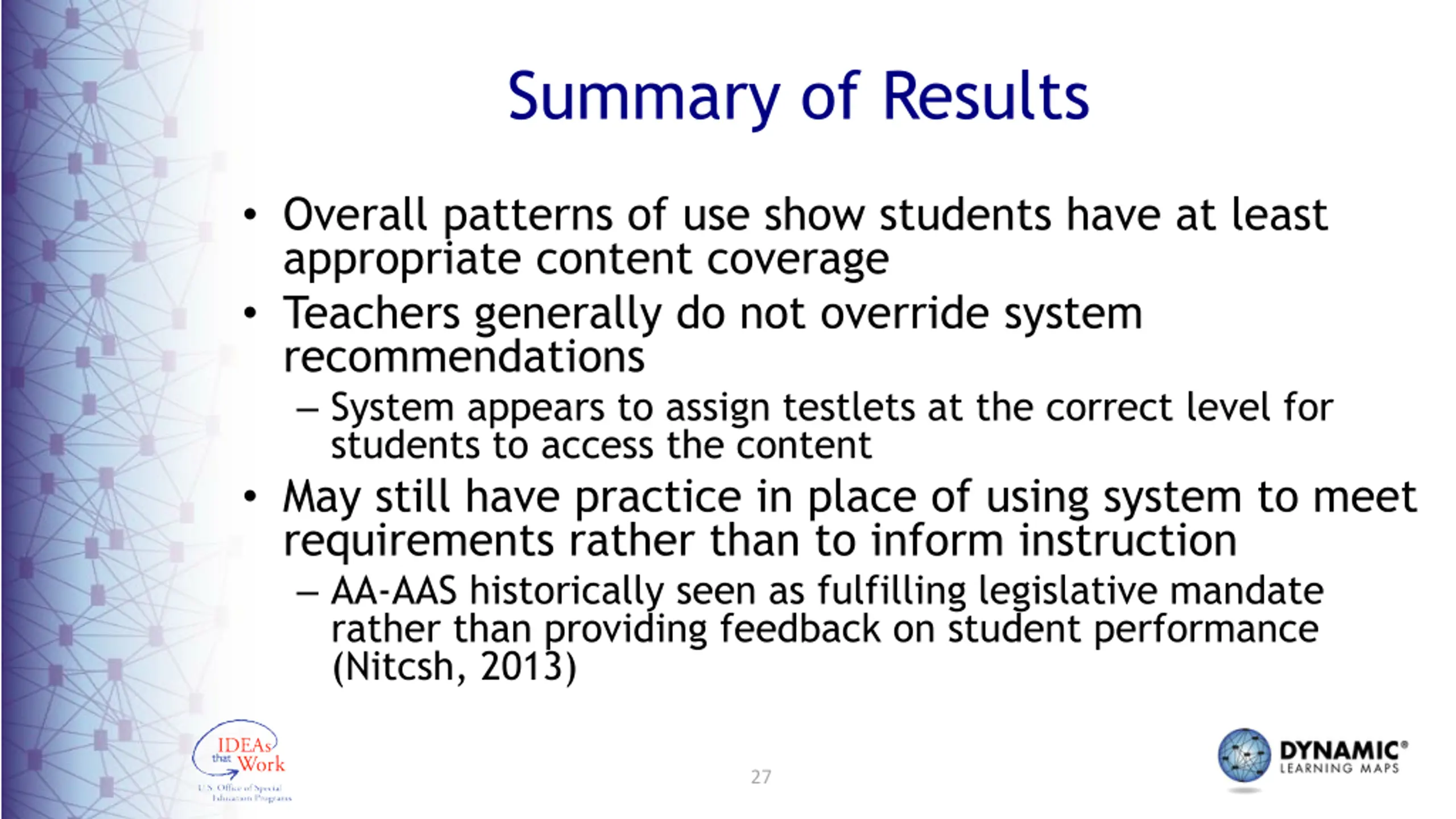 Summary of Results Overall patterns of use show students have at least appropriate content coverage Teachers generally do not override system recommendations System appears to assign testlets at the correct level for students to access the content May still have practice in place of using system to meet requirements rather than to inform instruction AA-AAS historically seen as fulfilling legislative mandate rather than providing feedback on student performance (Nitcsh, 2013) 27