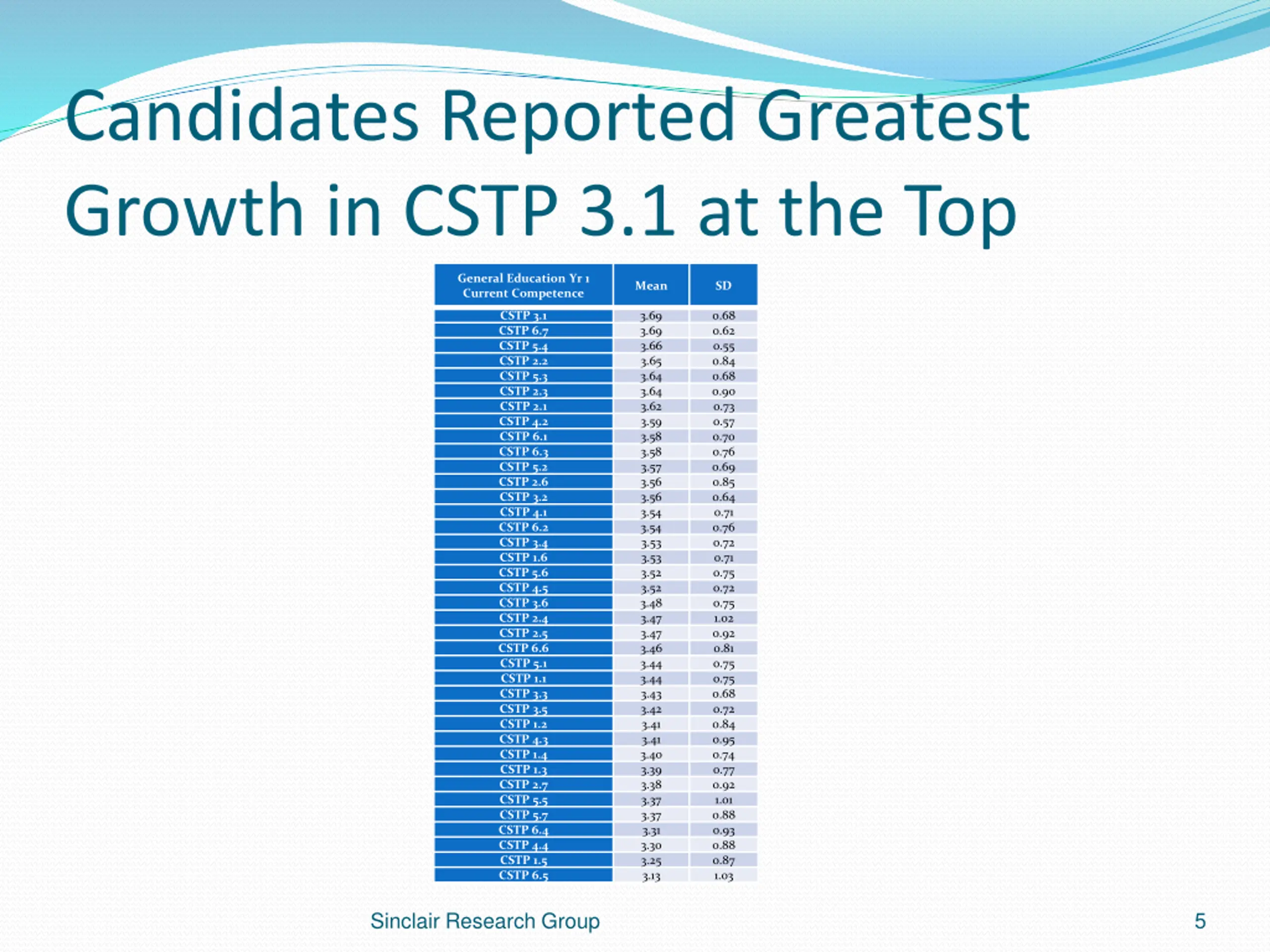 Candidates Reported Greatest Growth in CSTP 3.1 at the Top General Education Yr 1 Current Competence Mean SD CSTP 3.1 CSTP 6.7 CSTP 5.4 CSTP 2.2 CSTP 5.3 CSTP 2.3 CSTP 2.1 CSTP 4.2 CSTP 6.1 CSTP 6.3 CSTP 5.2 CSTP 2.6 CSTP 3.2 CSTP 4.1 CSTP 6.2 CSTP 3.4 CSTP 1.6 CSTP 5.6 CSTP 4.5 CSTP 3.6 CSTP 2.4 CSTP 2.5 CSTP 6.6 CSTP 5.1 CSTP 1.1 CSTP 3.3 CSTP 3.5 CSTP 1.2 CSTP 4.3 CSTP 1.4 CSTP 1.3 CSTP 2.7 CSTP 5.5 CSTP 5.7 CSTP 6.4 CSTP 4.4 CSTP 1.5 CSTP 6.5 3.69 3.69 3.66 3.65 3.64 3.64 3.62 3.59 3.58 3.58 3.57 3.56 3.56 3.54 3.54 3.53 3.53 3.52 3.52 3.48 3.47 3.47 3.46 3.44 3.44 3.43 3.42 3.41 3.41 3.40 3.39 3.38 3.37 3.37 3.31 3.30 3.25 3.13 0.68 0.62 0.55 0.84 0.68 0.90 0.73 0.57 0.70 0.76 0.69 0.85 0.64 0.71 0.76 0.72 0.71 0.75 0.72 0.75 1.02 0.92 0.81 0.75 0.75 0.68 0.72 0.84 0.95 0.74 0.77 0.92 1.01 0.88 0.93 0.88 0.87 1.03 Sinclair Research Group 5