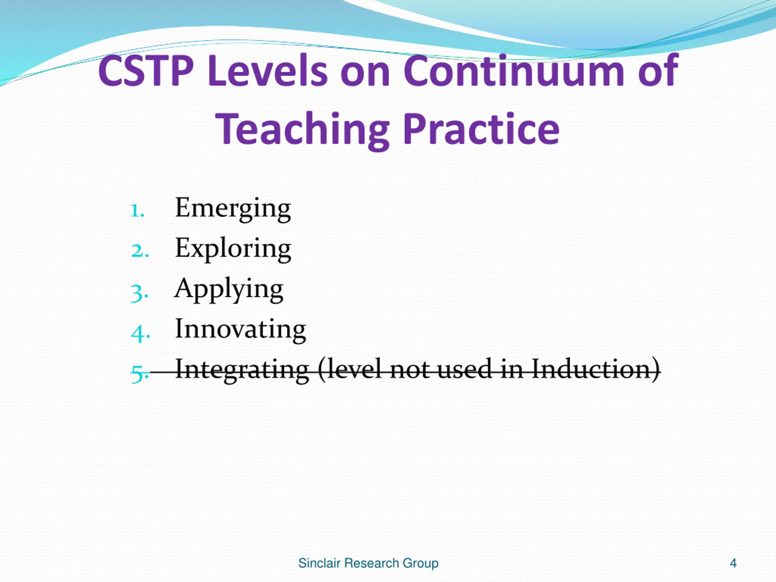 CSTP Levels on Continuum of Teaching Practice Emerging 1. 2. Exploring 3. Applying 4. Innovating 5. Integrating (level not used in Induction) Sinclair Research Group 4