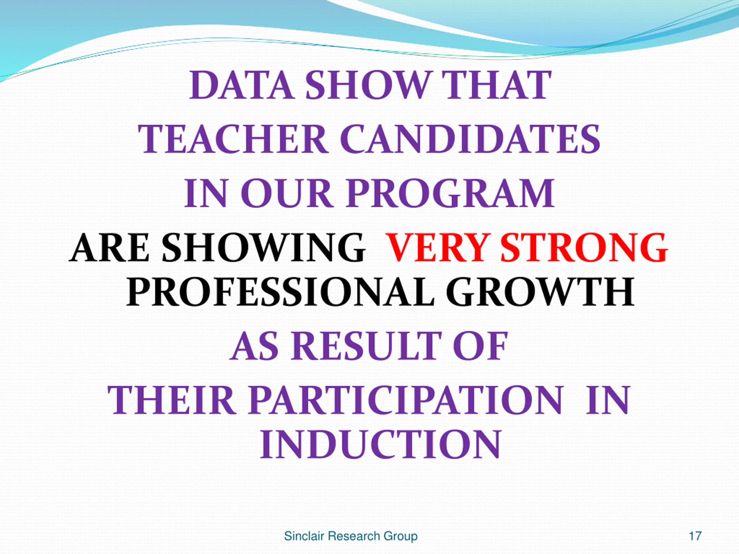DATA SHOW THAT TEACHER CANDIDATES IN OUR PROGRAM ARE SHOWING VERY STRONG PROFESSIONAL GROWTH AS RESULT OF THEIR PARTICIPATION IN INDUCTION Sinclair Research Group 17