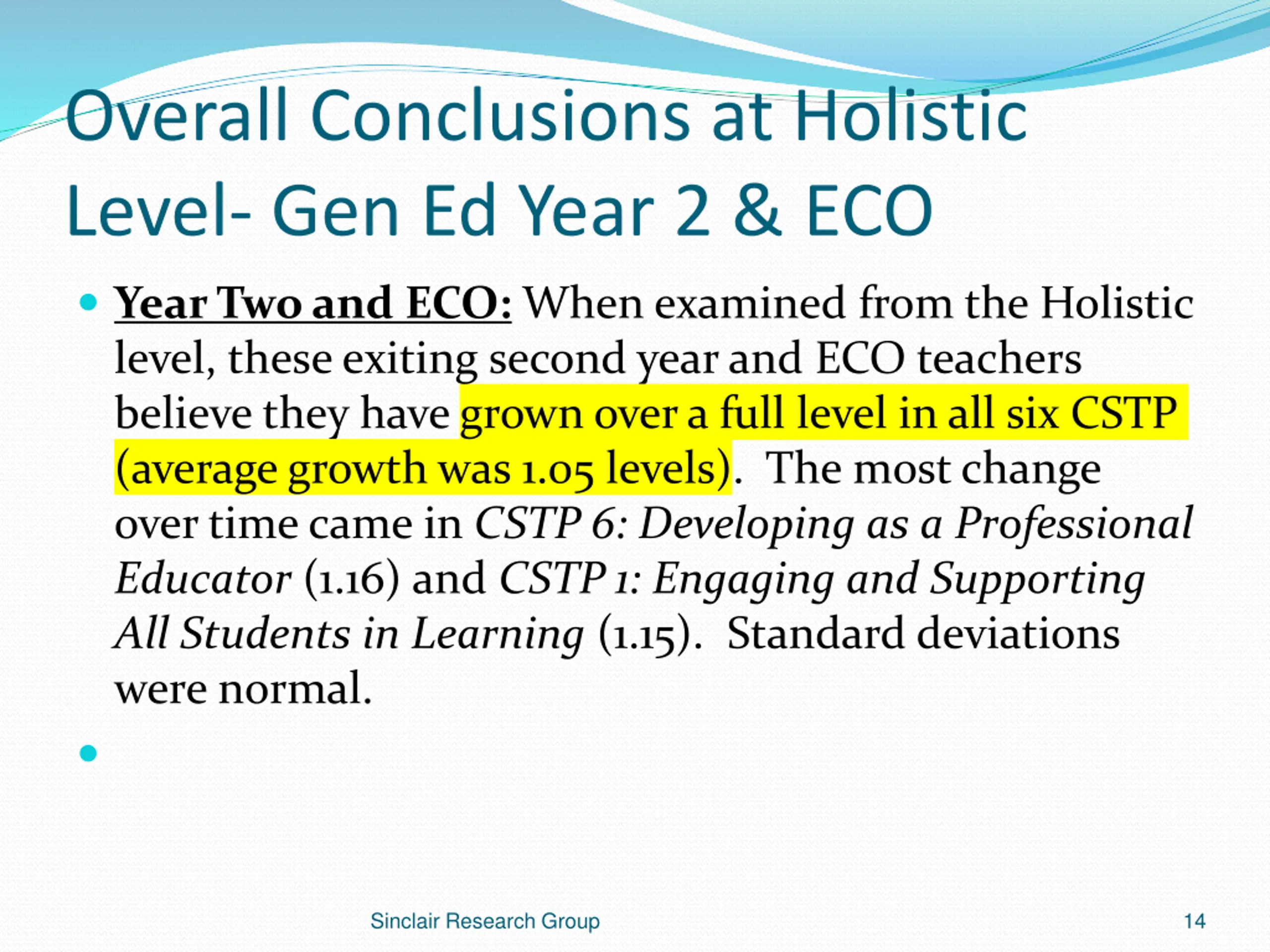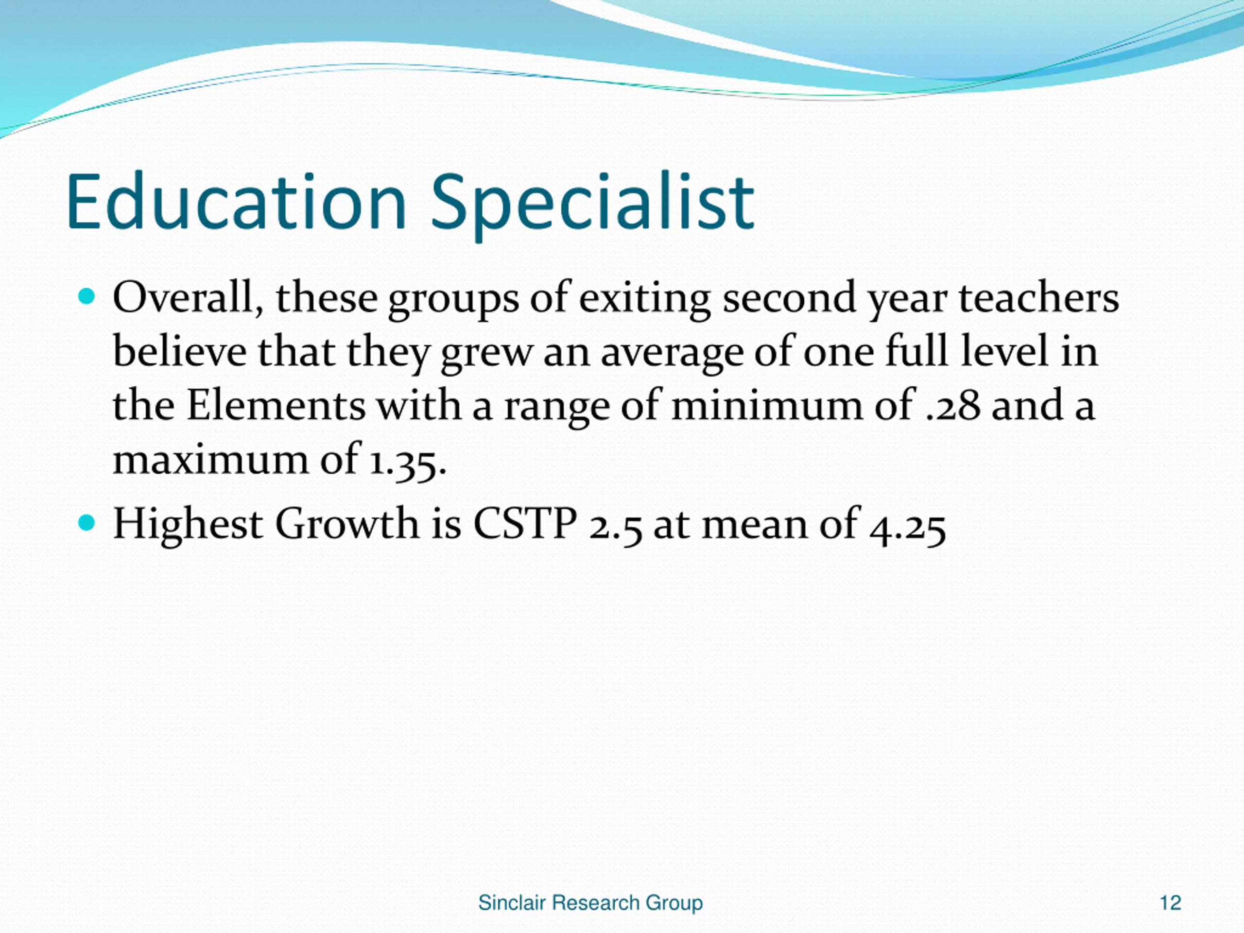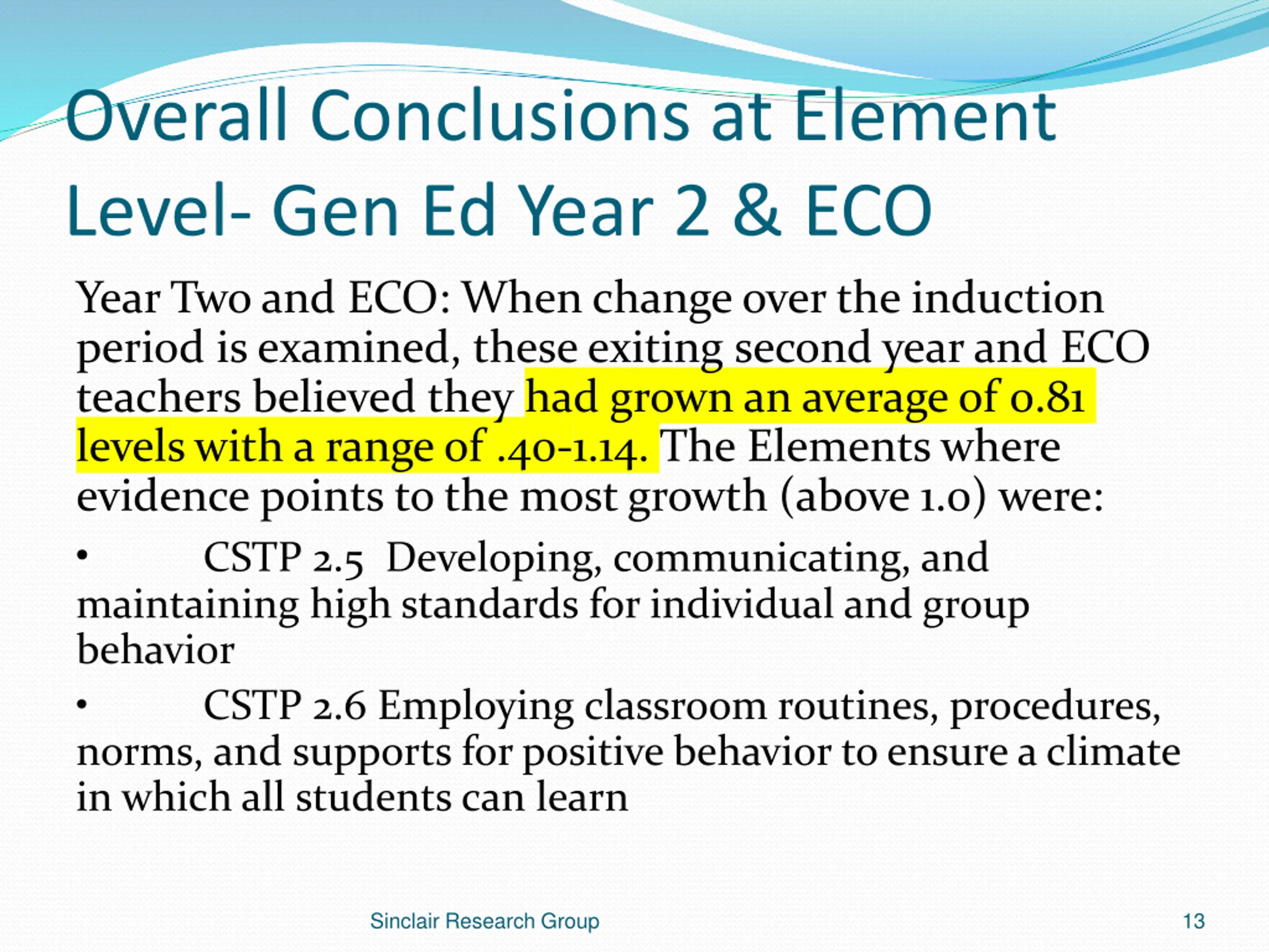 Education Specialist Overall, these groups of exiting second year teachers believe that they grew an average of one full level in the Elements with a range of minimum of .28 and a maximum of 1.35. Highest Growth is CSTP 2.5 at mean of 4.25 Sinclair Research Group 12