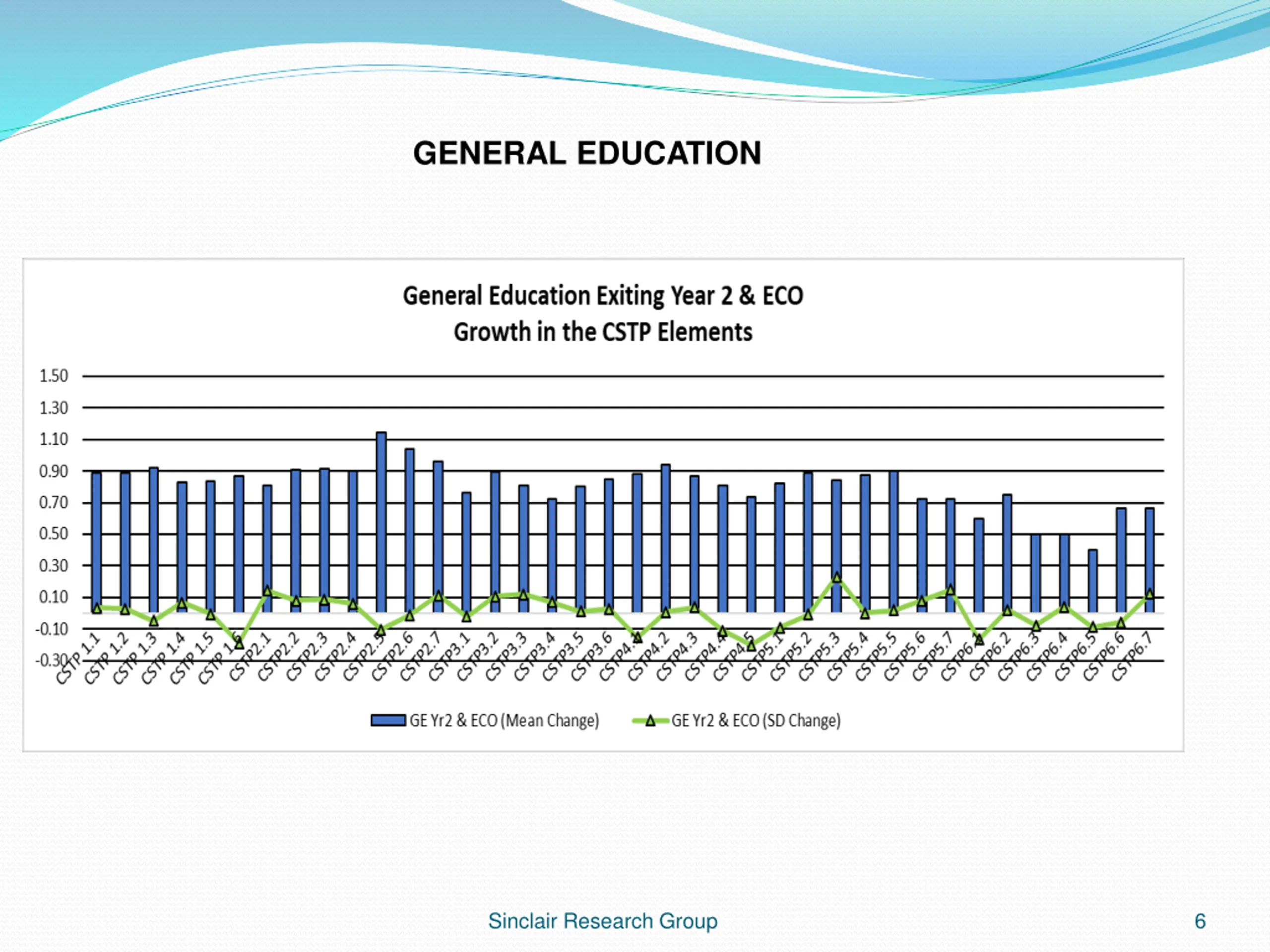 General Education Overall, these groups of exiting second year teachers believe that they grew an average of 0.8 levels in the Elements with minimum growth 0.4 and highest growth at 1.14. OVER ONE FULL LEVEL OF GROWTH. Highest Growth CSTP 2.5 Sinclair Research Group 8