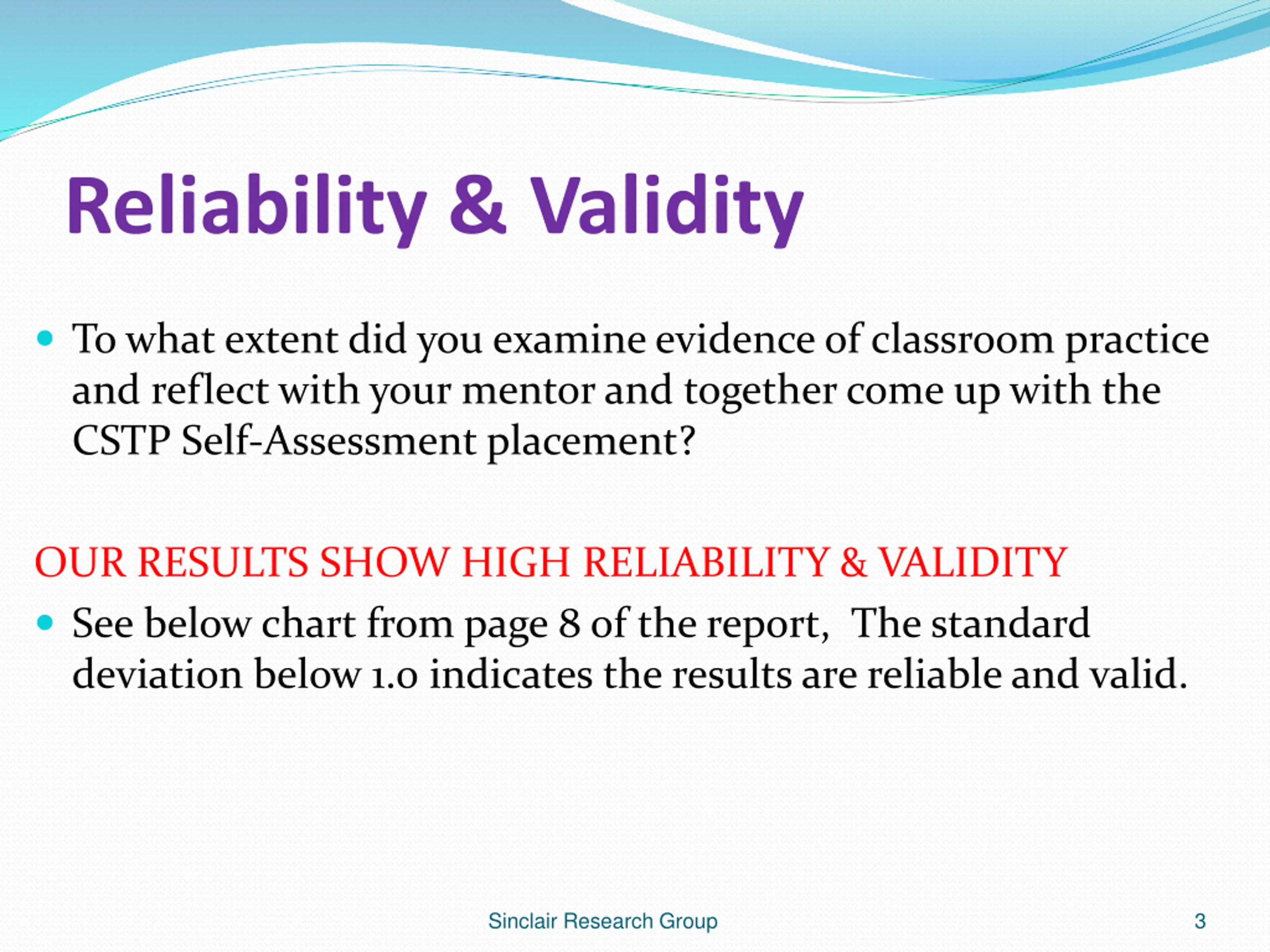 Reliability & Validity To what extent did you examine evidence of classroom practice and reflect with your mentor and together come up with the CSTP Self-Assessment placement? OUR RESULTS SHOW HIGH RELIABILITY & VALIDITY See below chart from page 8 of the report, The standard deviation below 1.0 indicates the results are reliable and valid. Sinclair Research Group 3