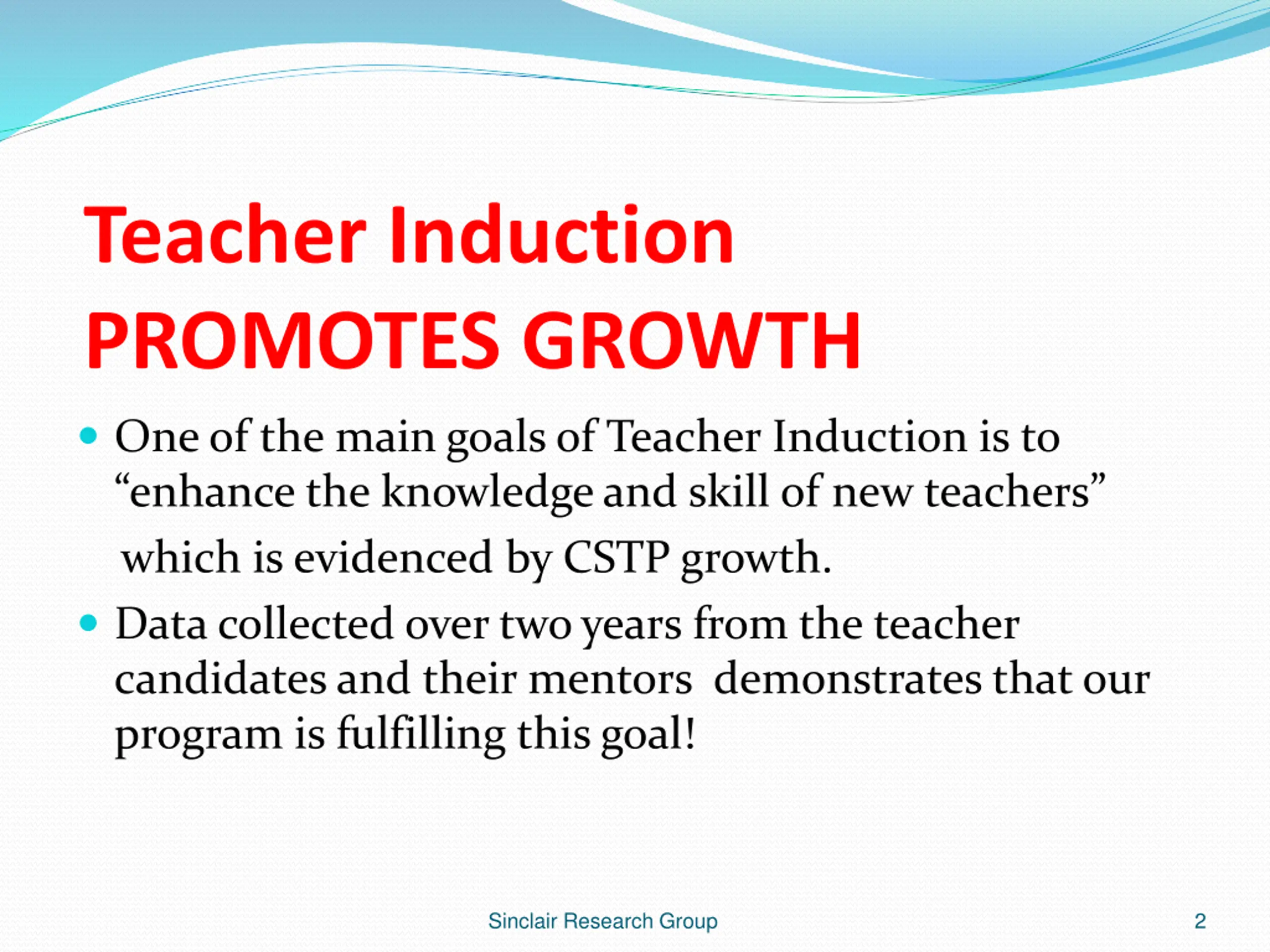 Teacher Induction PROMOTES GROWTH One of the main goals of Teacher Induction is to enhance the knowledge and skill of new teachers which is evidenced by CSTP growth. Data collected over two years from the teacher candidates and their mentors demonstrates that our program is fulfilling this goal! Sinclair Research Group 2