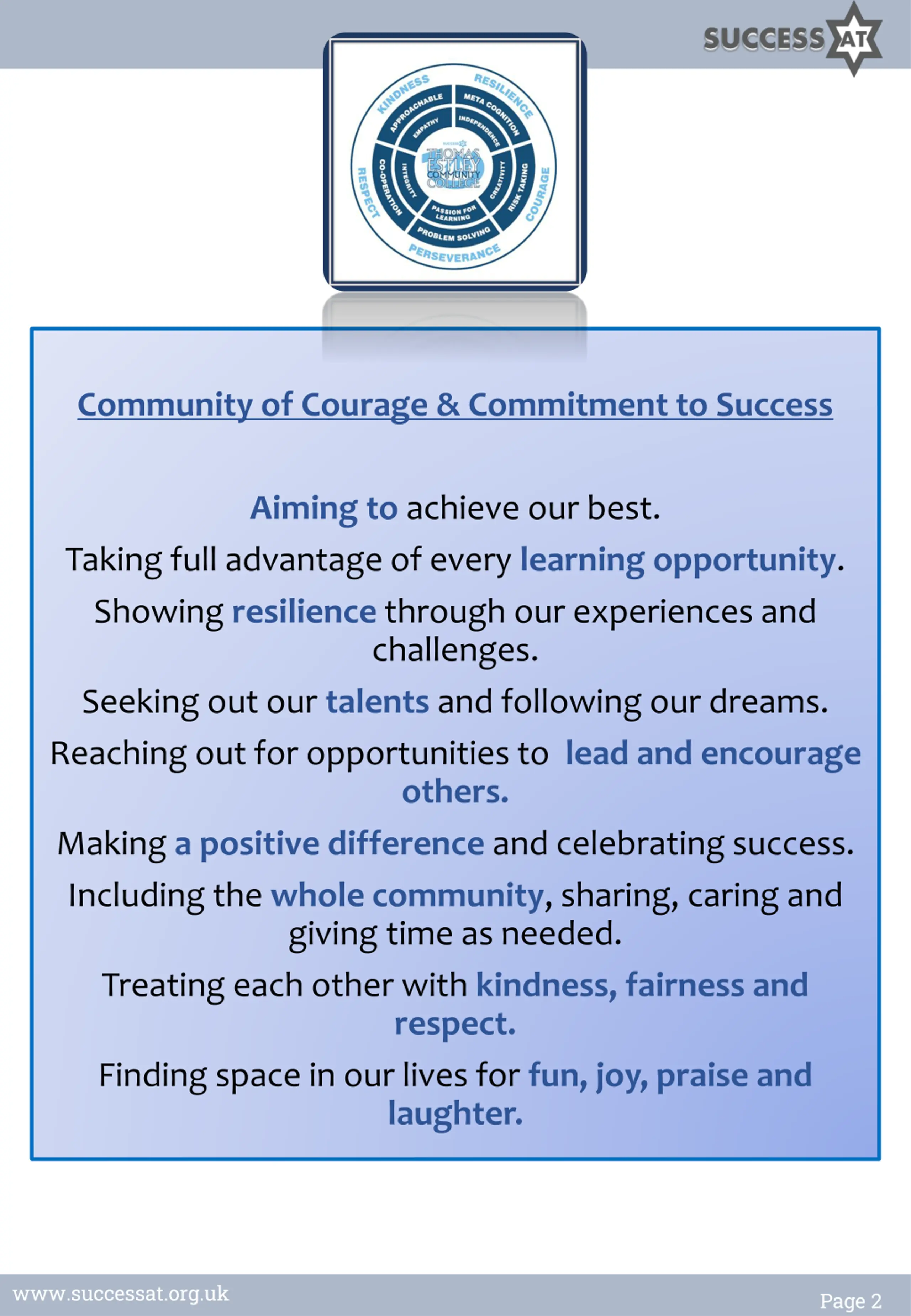 Community of Courage & Commitment to Success Aiming to achieve our best. Taking full advantage of every learning opportunity. Showing resilience through our experiences and challenges. Seeking out our talents and following our dreams. Reaching out for opportunities to lead and encourage others. Making a positive difference and celebrating success. Including the whole community, sharing, caring and giving time as needed. Treating each other with kindness, fairness and respect. Finding space in our lives for fun, joy, praise and laughter. www.successat.org.uk Page 2