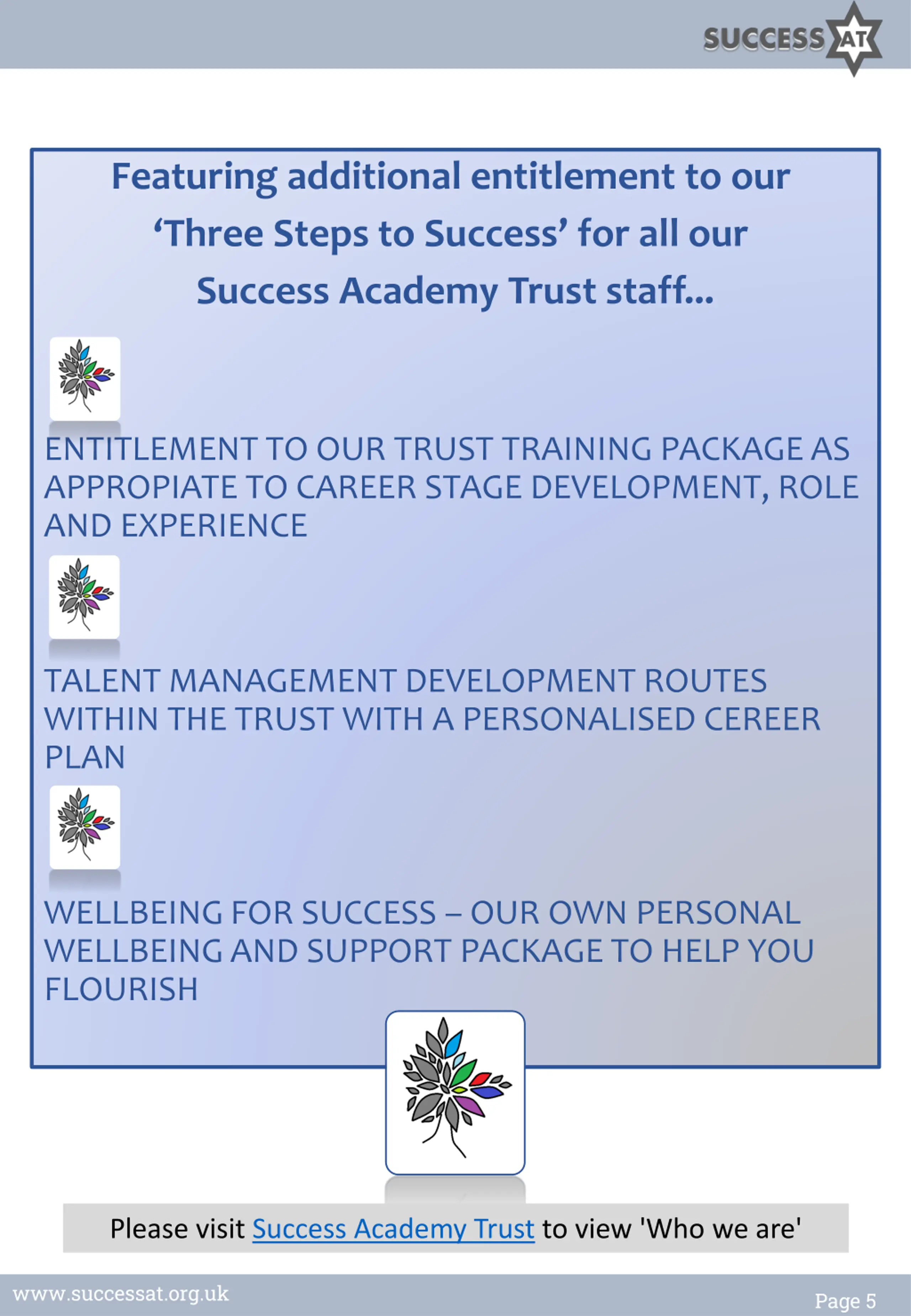 Featuring additional entitlement to our Three Steps to Success for all our Success Academy Trust staff... ENTITLEMENT TO OUR TRUST TRAINING PACKAGE AS APPROPIATE TO CAREER STAGE DEVELOPMENT, ROLE AND EXPERIENCE TALENT MANAGEMENT DEVELOPMENT ROUTES WITHIN THE TRUST WITH A PERSONALISED CEREER PLAN WELLBEING FOR SUCCESS OUR OWN PERSONAL WELLBEING AND SUPPORT PACKAGE TO HELP YOU FLOURISH Please visit Success Academy Trust to view 'Who we are' www.successat.org.uk Page 5