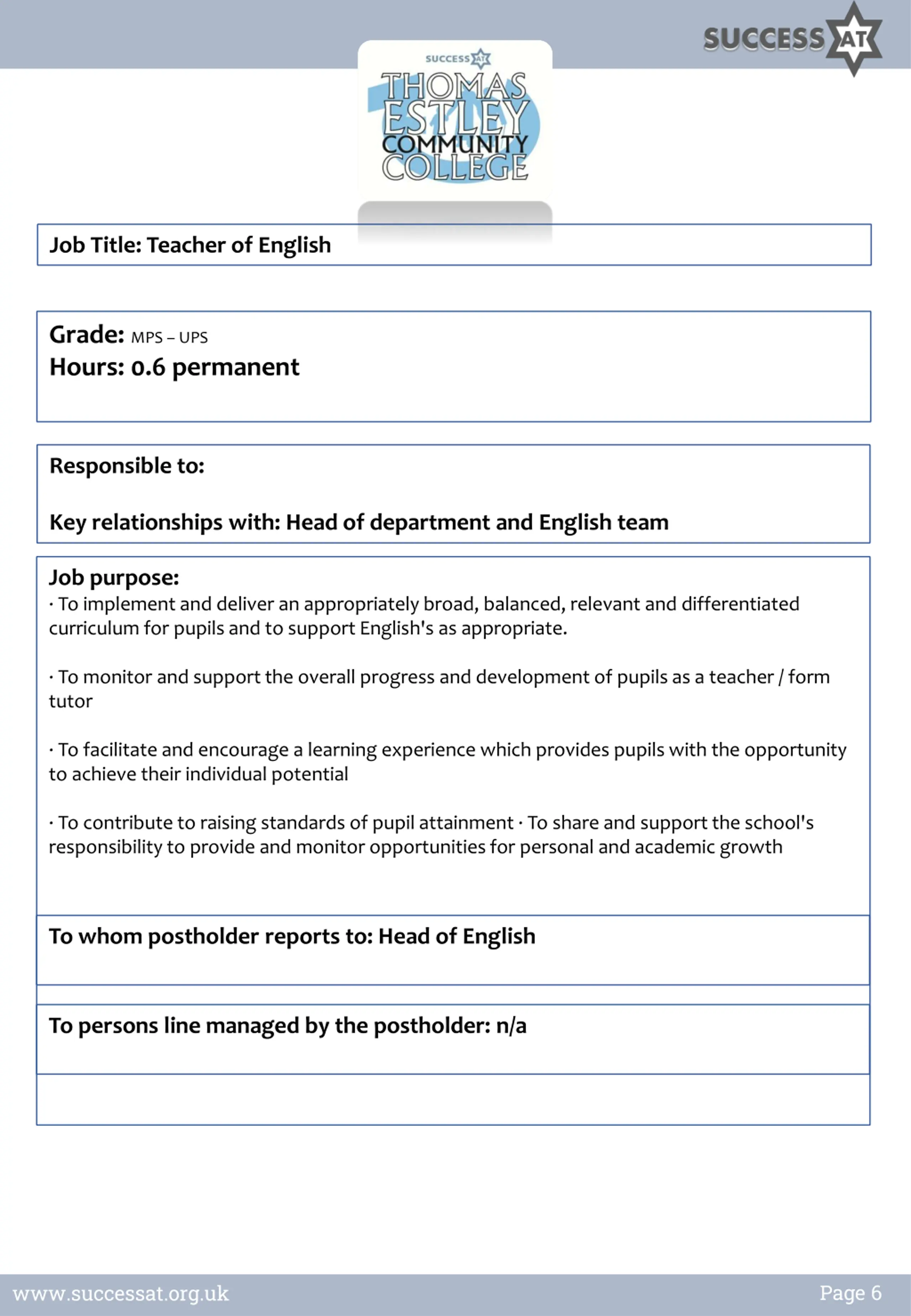 Job Title: Teacher of English Grade: MPS UPS Hours: 0.6 permanent Responsible to: Key relationships with: Head of department and English team Job purpose: To implement and deliver an appropriately broad, balanced, relevant and differentiated curriculum for pupils and to support English's as appropriate. To monitor and support the overall progress and development of pupils as a teacher / form tutor To facilitate and encourage a learning experience which provides pupils with the opportunity to achieve their individual potential To contribute to raising standards of pupil attainment To share and support the school's responsibility to provide and monitor opportunities for personal and academic growth To whom postholder reports to: Head of English To persons line managed by the postholder: n/a Page 6 www.successat.org.uk