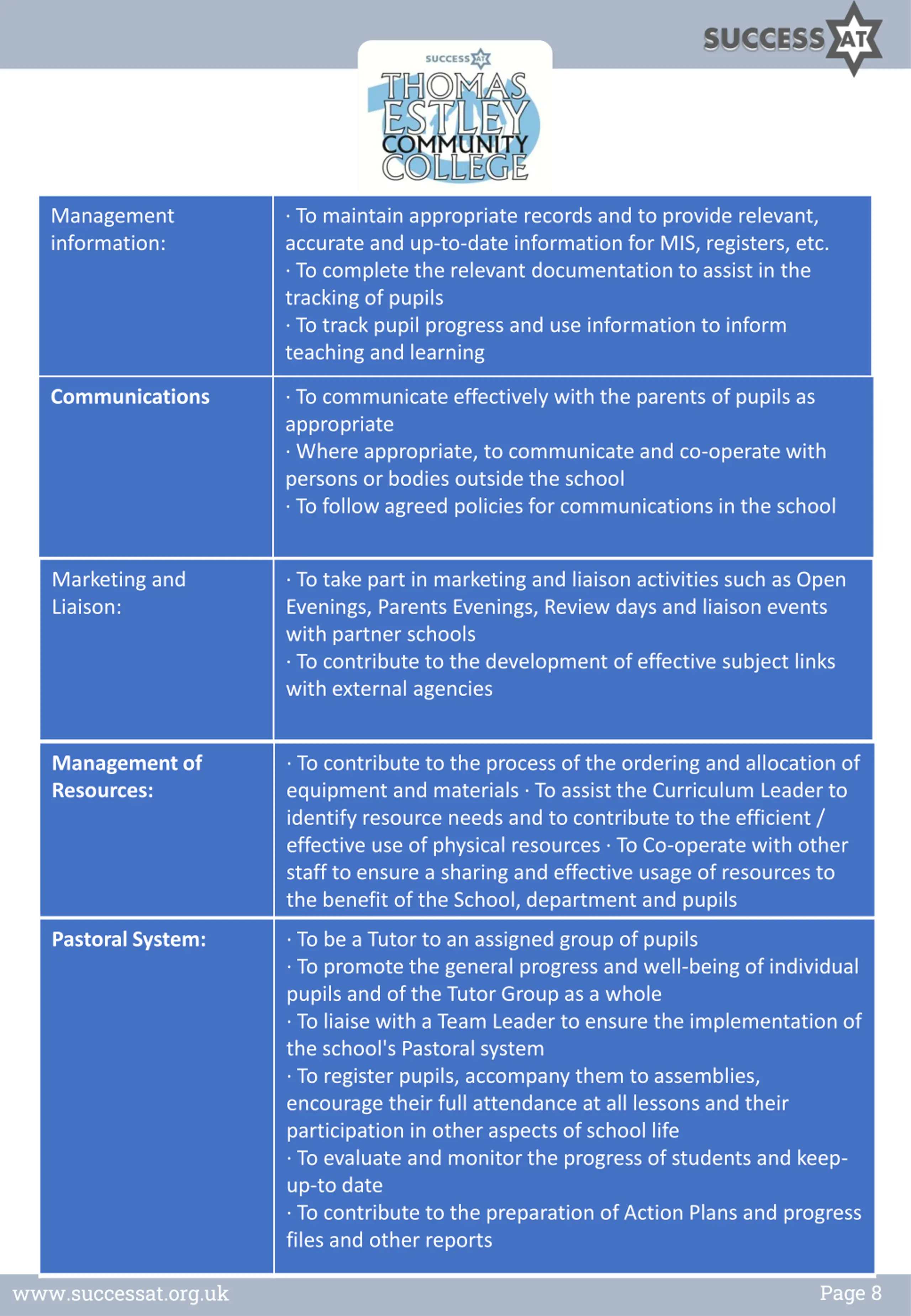 Management information: To maintain appropriate records and to provide relevant, accurate and up-to-date information for MIS, registers, etc. To complete the relevant documentation to assist in the tracking of pupils To track pupil progress and use information to inform teaching and learning Communications To communicate effectively with the parents of pupils as appropriate Where appropriate, to communicate and co-operate with persons or bodies outside the school To follow agreed policies for communications in the school Marketing and Liaison: To take part in marketing and liaison activities such as Open Evenings, Parents Evenings, Review days and liaison events with partner schools To contribute to the development of effective subject links with external agencies Management of Resources: To contribute to the process of the ordering and allocation of equipment and materials To assist the Curriculum Leader to identify resource needs and to contribute to the efficient / effective use of physical resources To Co-operate with other staff to ensure a sharing and effective usage of resources to the benefit of the School, department and pupils Pastoral System: To be a Tutor to an assigned group of pupils To promote the general progress and well-being of individual pupils and of the Tutor Group as a whole To liaise with a Team Leader to ensure the implementation of the school's Pastoral system To register pupils, accompany them to assemblies, encourage their full attendance at all lessons and their participation in other aspects of school life To evaluate and monitor the progress of students and keep- up-to date To contribute to the preparation of Action Plans and progress files and other reports Page 8 www.successat.org.uk