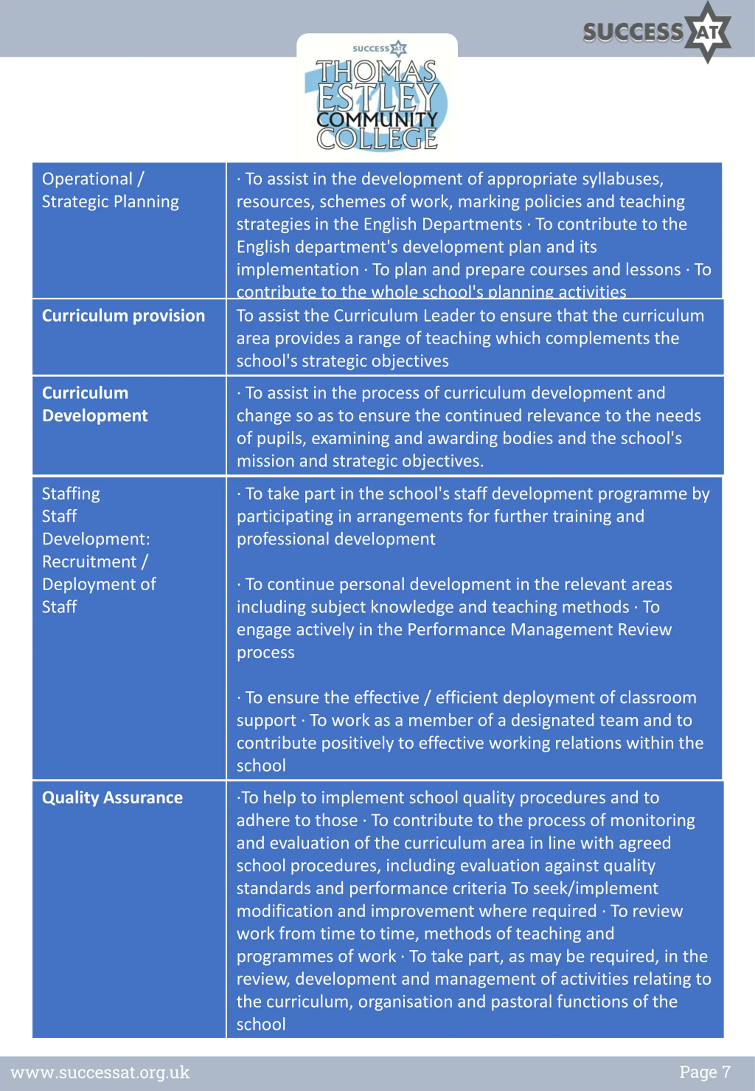 Operational / Strategic Planning To assist in the development of appropriate syllabuses, resources, schemes of work, marking policies and teaching strategies in the English Departments To contribute to the English department's development plan and its implementation To plan and prepare courses and lessons To contribute to the whole school's planning activities To assist the Curriculum Leader to ensure that the curriculum area provides a range of teaching which complements the school's strategic objectives Curriculum provision Curriculum Development To assist in the process of curriculum development and change so as to ensure the continued relevance to the needs of pupils, examining and awarding bodies and the school's mission and strategic objectives. Staffing Staff Development: Recruitment / Deployment of Staff To take part in the school's staff development programme by participating in arrangements for further training and professional development To continue personal development in the relevant areas including subject knowledge and teaching methods To engage actively in the Performance Management Review process To ensure the effective / efficient deployment of classroom support To work as a member of a designated team and to contribute positively to effective working relations within the school Quality Assurance To help to implement school quality procedures and to adhere to those To contribute to the process of monitoring and evaluation of the curriculum area in line with agreed school procedures, including evaluation against quality standards and performance criteria To seek/implement modification and improvement where required To review work from time to time, methods of teaching and programmes of work To take part, as may be required, in the review, development and management of activities relating to the curriculum, organisation and pastoral functions of the school Page 7 www.successat.org.uk