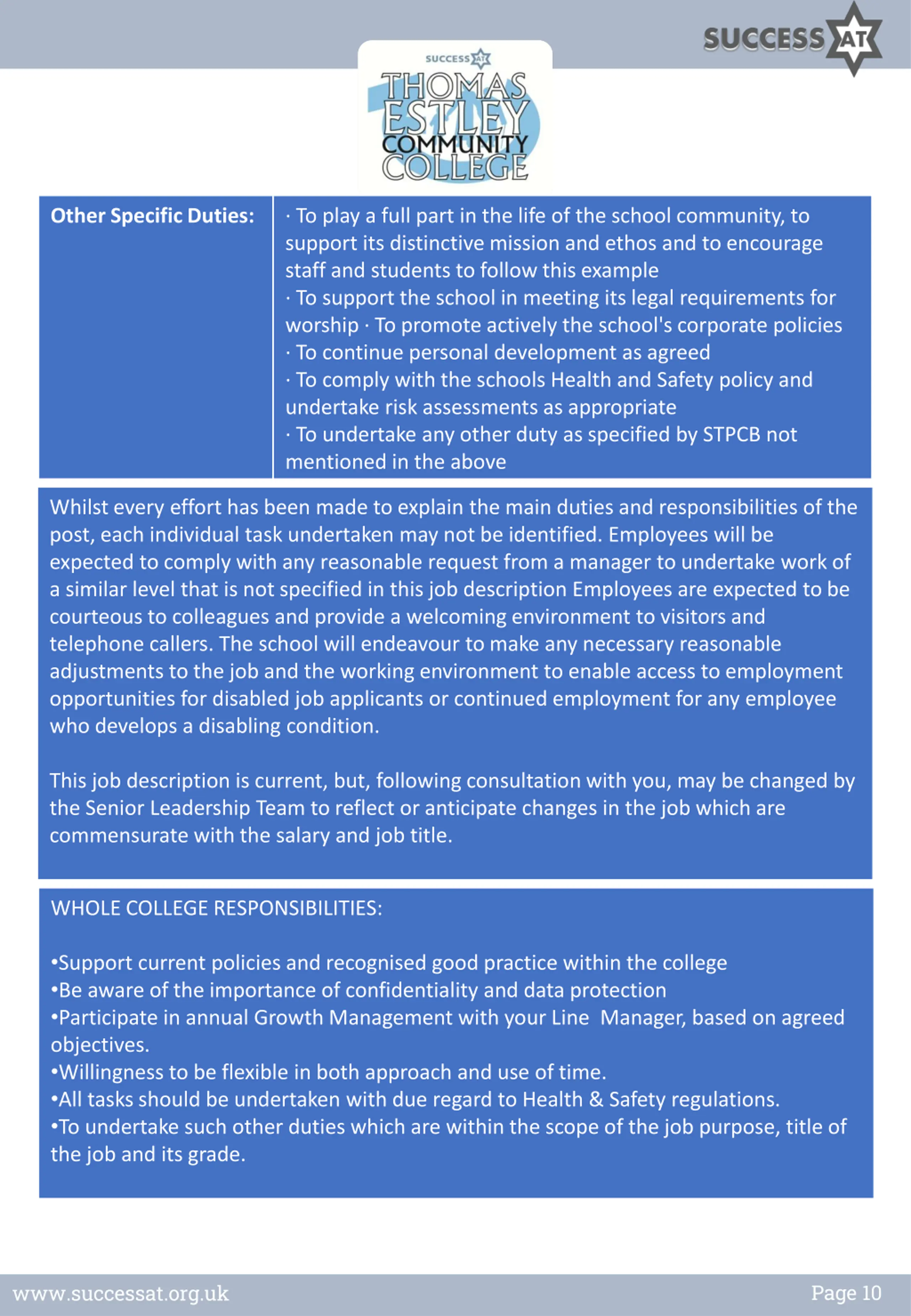 Other Specific Duties: To play a full part in the life of the school community, to support its distinctive mission and ethos and to encourage staff and students to follow this example To support the school in meeting its legal requirements for worship To promote actively the school's corporate policies To continue personal development as agreed To comply with the schools Health and Safety policy and undertake risk assessments as appropriate To undertake any other duty as specified by STPCB not mentioned in the above Whilst every effort has been made to explain the main duties and responsibilities of the post, each individual task undertaken may not be identified. Employees will be expected to comply with any reasonable request from a manager to undertake work of a similar level that is not specified in this job description Employees are expected to be courteous to colleagues and provide a welcoming environment to visitors and telephone callers. The school will endeavour to make any necessary reasonable adjustments to the job and the working environment to enable access to employment opportunities for disabled job applicants or continued employment for any employee who develops a disabling condition. This job description is current, but, following consultation with you, may be changed by the Senior Leadership Team to reflect or anticipate changes in the job which are commensurate with the salary and job title. WHOLE COLLEGE RESPONSIBILITIES: Support current policies and recognised good practice within the college Be aware of the importance of confidentiality and data protection Participate in annual Growth Management with your Line Manager, based on agreed objectives. Willingness to be flexible in both approach and use of time. All tasks should be undertaken with due regard to Health & Safety regulations. To undertake such other duties which are within the scope of the job purpose, title of the job and its grade. Page 10 www.successat.org.uk