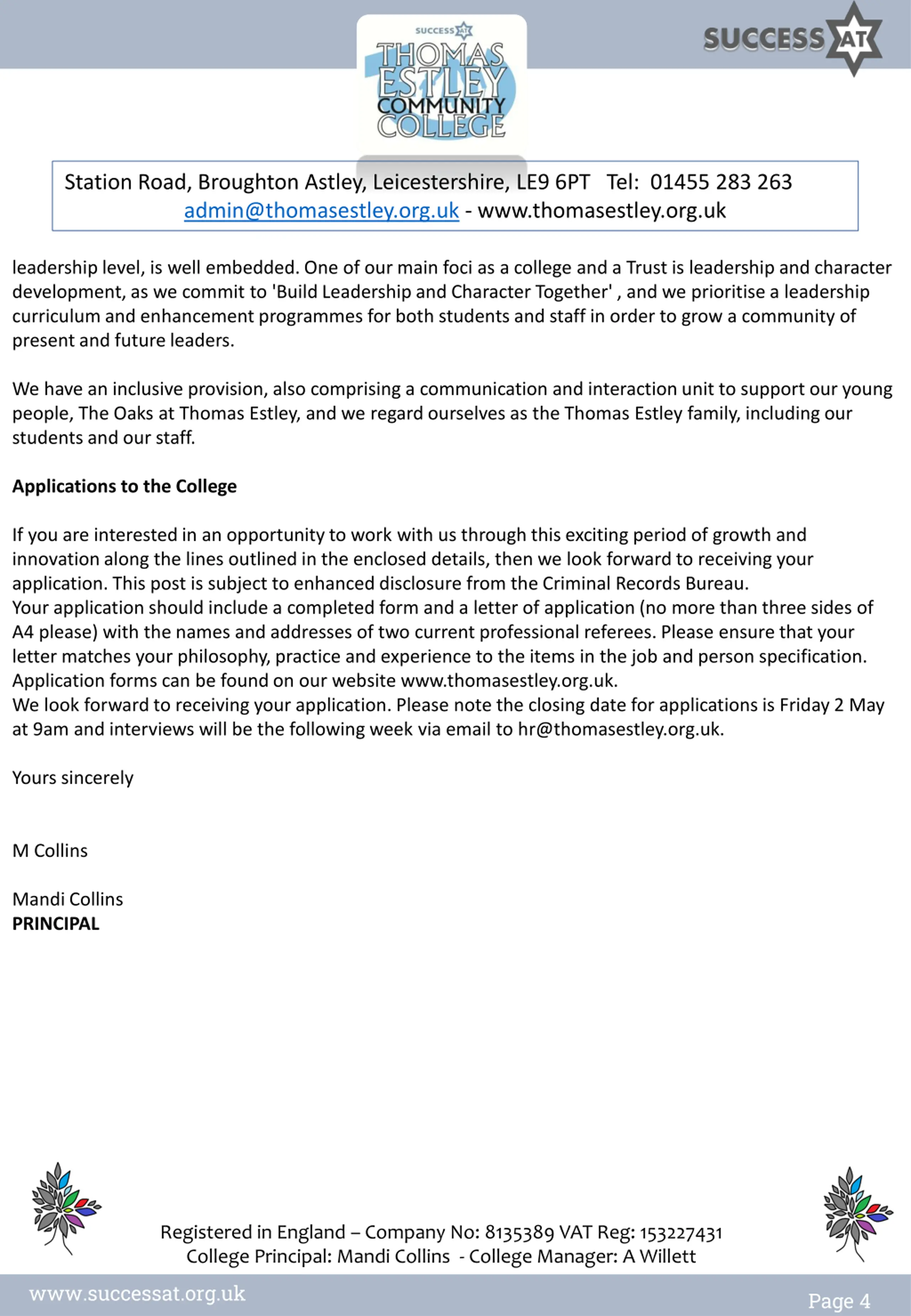 Station Road, Broughton Astley, Leicestershire, LE9 6PT Tel: 01455 283 263 admin@thomasestley.org.uk - www.thomasestley.org.uk leadership level, is well embedded. One of our main foci as a college and a Trust is leadership and character development, as we commit to 'Build Leadership and Character Together' , and we prioritise a leadership curriculum and enhancement programmes for both students and staff in order to grow a community of present and future leaders. We have an inclusive provision, also comprising a communication and interaction unit to support our young people, The Oaks at Thomas Estley, and we regard ourselves as the Thomas Estley family, including our students and our staff. Applications to the College If you are interested in an opportunity to work with us through this exciting period of growth and innovation along the lines outlined in the enclosed details, then we look forward to receiving your application. This post is subject to enhanced disclosure from the Criminal Records Bureau. Your application should include a completed form and a letter of application (no more than three sides of A4 please) with the names and addresses of two current professional referees. Please ensure that your letter matches your philosophy, practice and experience to the items in the job and person specification. Application forms can be found on our website www.thomasestley.org.uk. We look forward to receiving your application. Please note the closing date for applications is Friday 2 May at 9am and interviews will be the following week via email to hr@thomasestley.org.uk. Yours sincerely M Collins Mandi Collins PRINCIPAL Registered in England Company No: 8135389 VAT Reg: 153227431 College Principal: Mandi Collins - College Manager: A Willett www.successat.org.uk Page 4