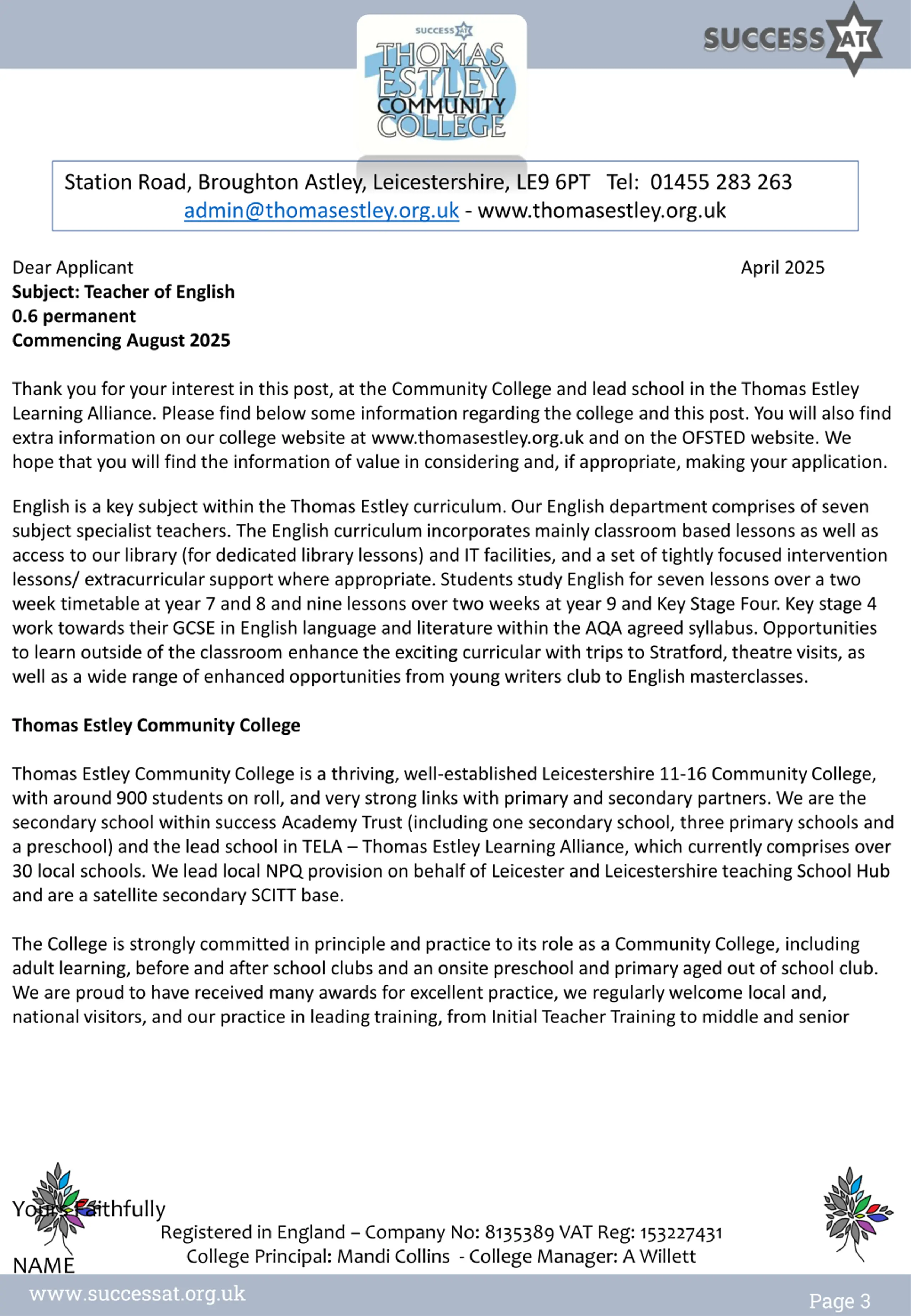 Station Road, Broughton Astley, Leicestershire, LE9 6PT Tel: 01455 283 263 admin@thomasestley.org.uk - www.thomasestley.org.uk Dear Applicant Subject: Teacher of English 0.6 permanent Commencing August 2025 April 2025 Thank you for your interest in this post, at the Community College and lead school in the Thomas Estley Learning Alliance. Please find below some information regarding the college and this post. You will also find extra information on our college website at www.thomasestley.org.uk and on the OFSTED website. We hope that you will find the information of value in considering and, if appropriate, making your application. English is a key subject within the Thomas Estley curriculum. Our English department comprises of seven subject specialist teachers. The English curriculum incorporates mainly classroom based lessons as well as access to our library (for dedicated library lessons) and IT facilities, and a set of tightly focused intervention lessons/ extracurricular support where appropriate. Students study English for seven lessons over a two week timetable at year 7 and 8 and nine lessons over two weeks at year 9 and Key Stage Four. Key stage 4 work towards their GCSE in English language and literature within the AQA agreed syllabus. Opportunities to learn outside of the classroom enhance the exciting curricular with trips to Stratford, theatre visits, as well as a wide range of enhanced opportunities from young writers club to English masterclasses. Thomas Estley Community College Thomas Estley Community College is a thriving, well-established Leicestershire 11-16 Community College, with around 900 students on roll, and very strong links with primary and secondary partners. We are the secondary school within success Academy Trust (including one secondary school, three primary schools and a preschool) and the lead school in TELA Thomas Estley Learning Alliance, which currently comprises over 30 local schools. We lead local NPQ provision on behalf of Leicester and Leicestershire teaching School Hub and are a satellite secondary SCITT base. The College is strongly committed in principle and practice to its role as a Community College, including adult learning, before and after school clubs and an onsite preschool and primary aged out of school club. We are proud to have received many awards for excellent practice, we regularly welcome local and, national visitors, and our practice in leading training, from Initial Teacher Training to middle and senior Yours Faithfully Registered in England Company No: 8135389 VAT Reg: 153227431 College Principal: Mandi Collins - College Manager: A Willett NAME www.successat.org.uk Page 3