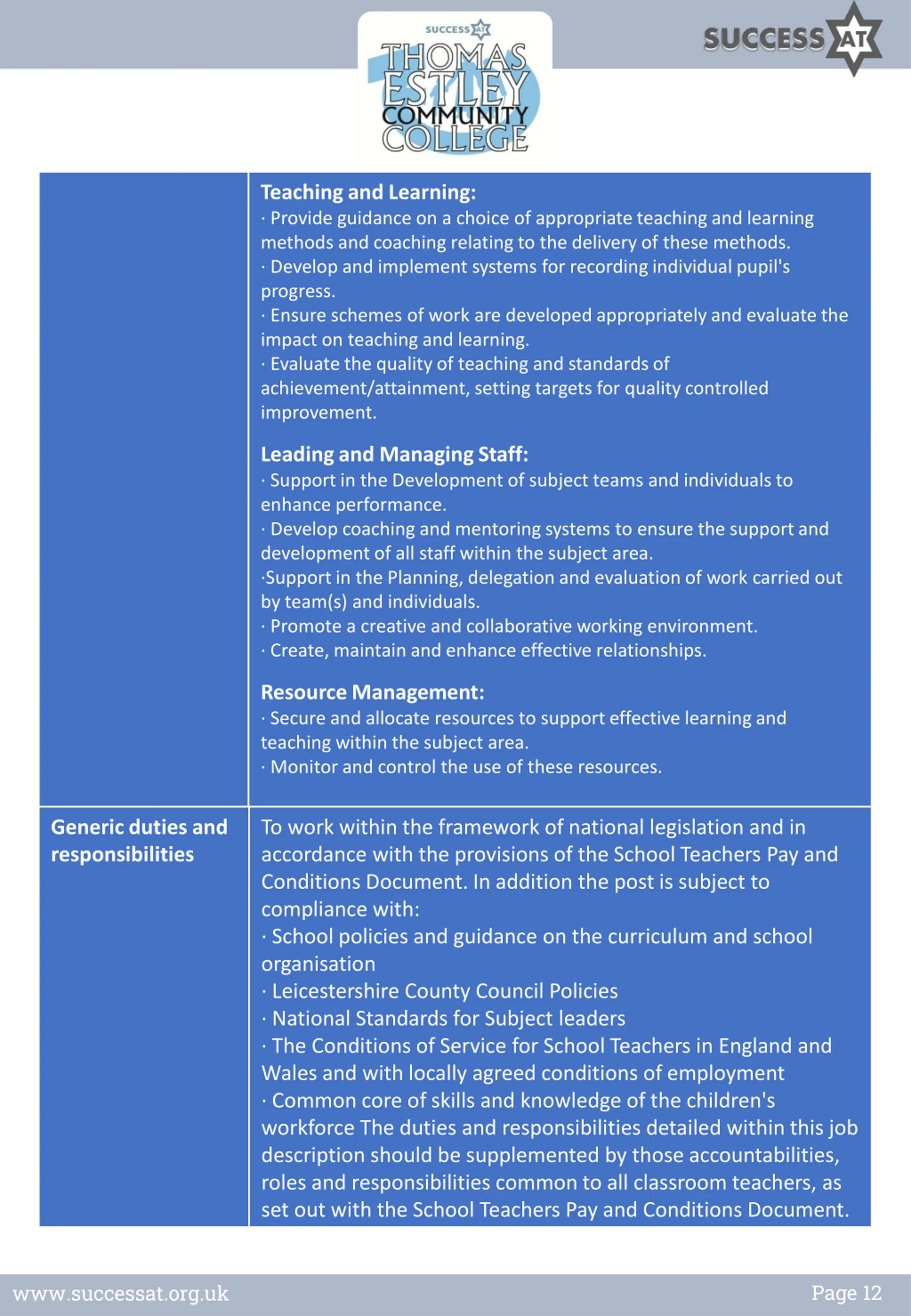 Teaching and Learning: Provide guidance on a choice of appropriate teaching and learning methods and coaching relating to the delivery of these methods. Develop and implement systems for recording individual pupil's progress. Ensure schemes of work are developed appropriately and evaluate the impact on teaching and learning. Evaluate the quality of teaching and standards of achievement/attainment, setting targets for quality controlled improvement. Leading and Managing Staff: Support in the Development of subject teams and individuals to enhance performance. Develop coaching and mentoring systems to ensure the support and development of all staff within the subject area. Support in the Planning, delegation and evaluation of work carried out by team(s) and individuals. Promote a creative and collaborative working environment. Create, maintain and enhance effective relationships. Resource Management: Secure and allocate resources to support effective learning and teaching within the subject area. Monitor and control the use of these resources. Generic duties and responsibilities To work within the framework of national legislation and in accordance with the provisions of the School Teachers Pay and Conditions Document. In addition the post is subject to compliance with: School policies and guidance on the curriculum and school organisation Leicestershire County Council Policies National Standards for Subject leaders The Conditions of Service for School Teachers in England and Wales and with locally agreed conditions of employment Common core of skills and knowledge of the children's workforce The duties and responsibilities detailed within this job description should be supplemented by those accountabilities, roles and responsibilities common to all classroom teachers, as set out with the School Teachers Pay and Conditions Document. Page 12 www.successat.org.uk