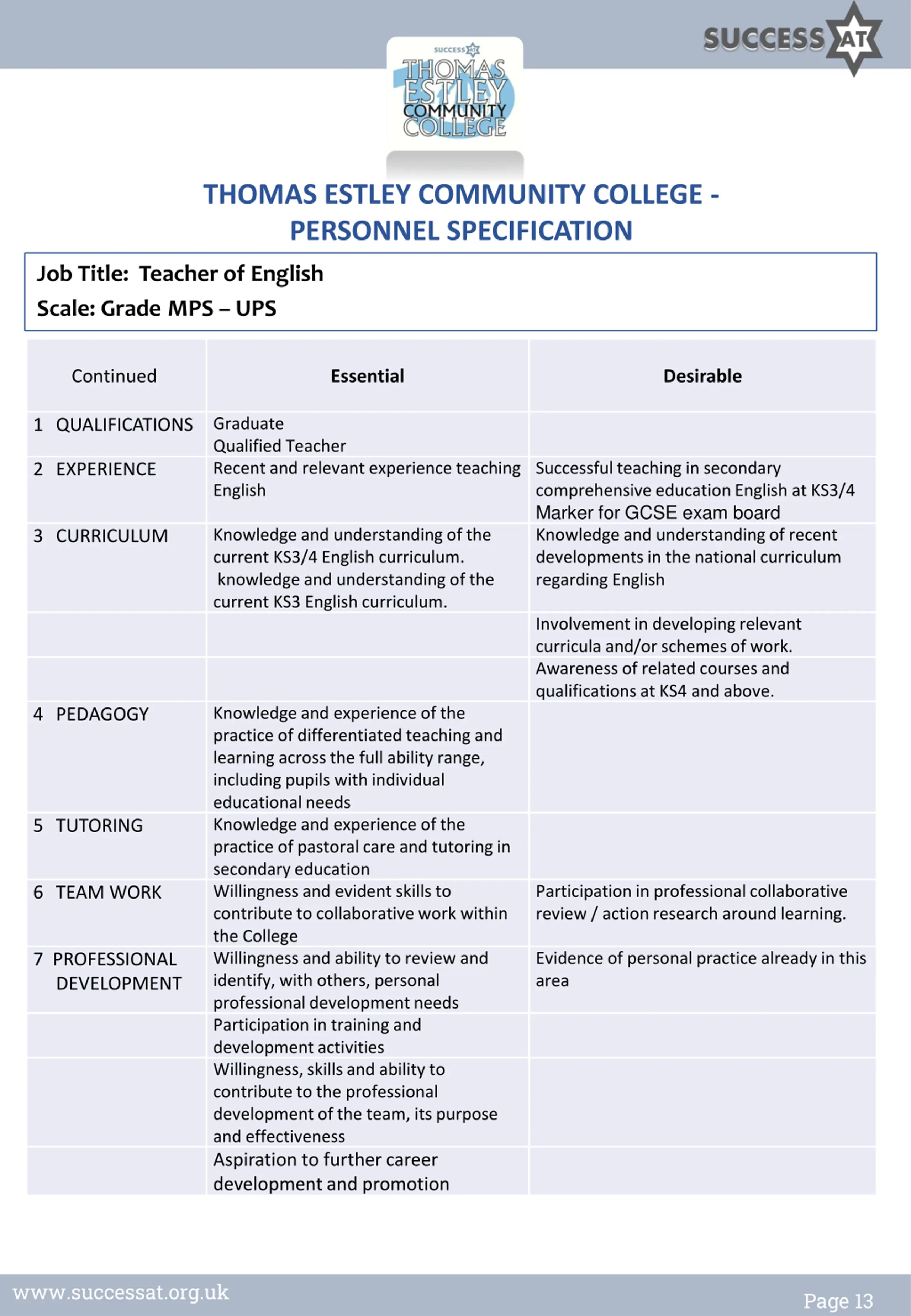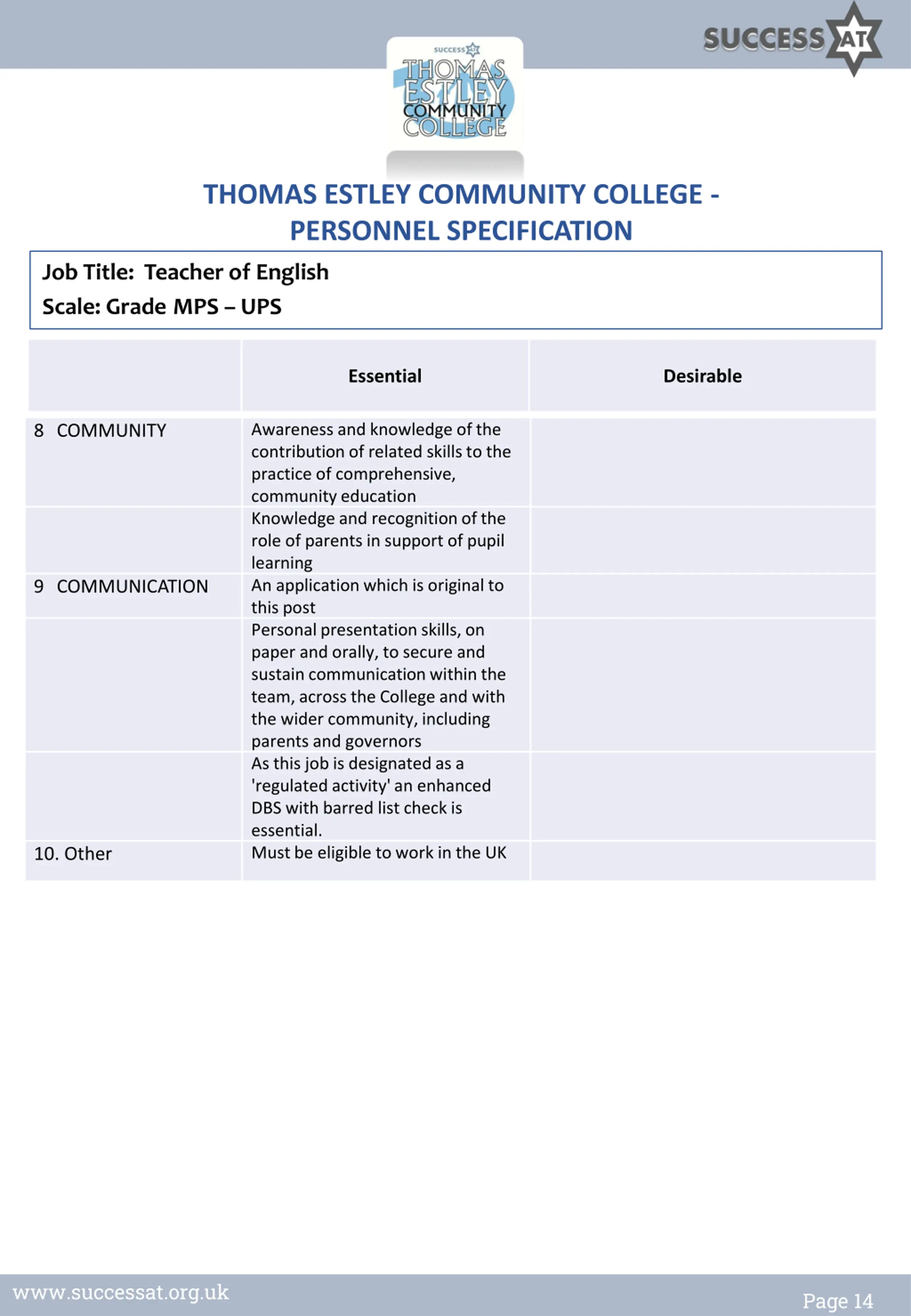 THOMAS ESTLEY COMMUNITY COLLEGE - PERSONNEL SPECIFICATION Job Title: Teacher of English Scale: Grade MPS UPS Essential Desirable Awareness and knowledge of the contribution of related skills to the practice of comprehensive, community education Knowledge and recognition of the role of parents in support of pupil learning An application which is original to this post Personal presentation skills, on paper and orally, to secure and sustain communication within the team, across the College and with the wider community, including parents and governors As this job is designated as a 'regulated activity' an enhanced DBS with barred list check is essential. Must be eligible to work in the UK 8 COMMUNITY 9 COMMUNICATION 10. Other www.successat.org.uk Page 14