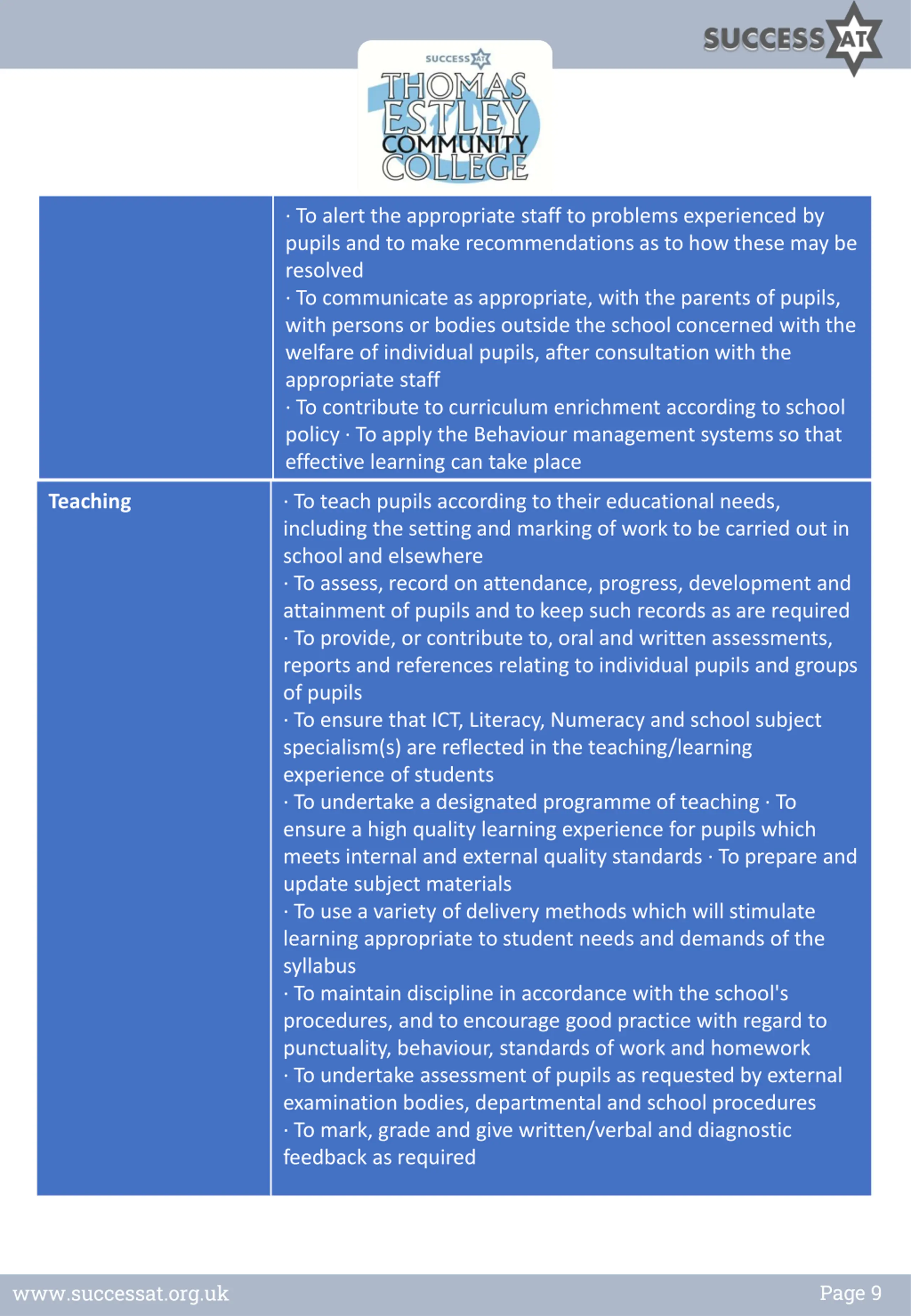 To alert the appropriate staff to problems experienced by pupils and to make recommendations as to how these may be resolved To communicate as appropriate, with the parents of pupils, with persons or bodies outside the school concerned with the welfare of individual pupils, after consultation with the appropriate staff To contribute to curriculum enrichment according to school policy To apply the Behaviour management systems so that effective learning can take place Teaching To teach pupils according to their educational needs, including the setting and marking of work to be carried out in school and elsewhere To assess, record on attendance, progress, development and attainment of pupils and to keep such records as are required To provide, or contribute to, oral and written assessments, reports and references relating to individual pupils and groups of pupils To ensure that ICT, Literacy, Numeracy and school subject specialism(s) are reflected in the teaching/learning experience of students To undertake a designated programme of teaching To ensure a high quality learning experience for pupils which meets internal and external quality standards To prepare and update subject materials To use a variety of delivery methods which will stimulate learning appropriate to student needs and demands of the syllabus To maintain discipline in accordance with the school's procedures, and to encourage good practice with regard to punctuality, behaviour, standards of work and homework To undertake assessment of pupils as requested by external examination bodies, departmental and school procedures To mark, grade and give written/verbal and diagnostic feedback as required Page 9 www.successat.org.uk