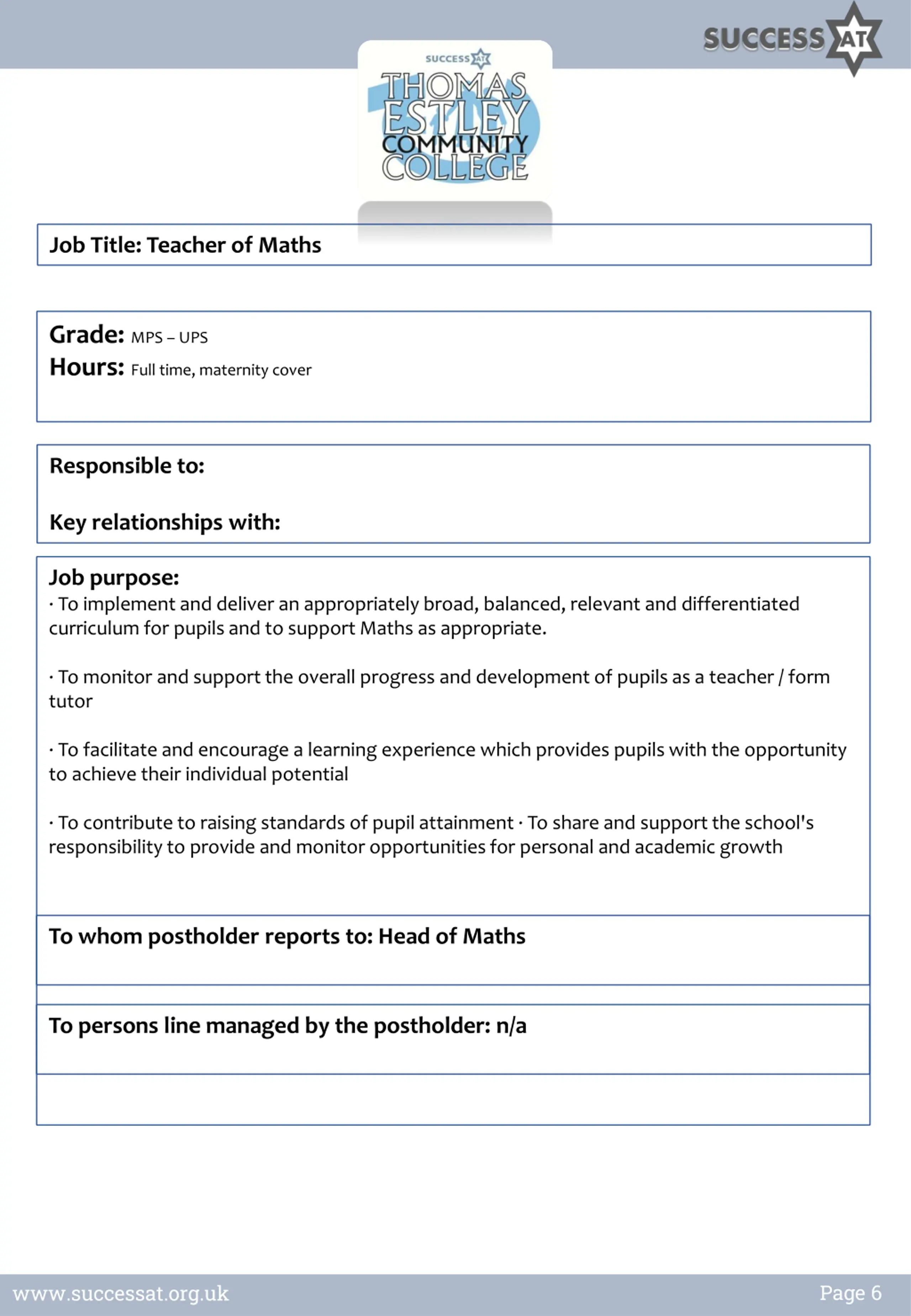 Job Title: Teacher of Maths Grade: MPS UPS Hours: Full time, maternity cover Responsible to: Key relationships with: Job purpose: To implement and deliver an appropriately broad, balanced, relevant and differentiated curriculum for pupils and to support Maths as appropriate. To monitor and support the overall progress and development of pupils as a teacher / form tutor To facilitate and encourage a learning experience which provides pupils with the opportunity to achieve their individual potential To contribute to raising standards of pupil attainment To share and support the school's responsibility to provide and monitor opportunities for personal and academic growth To whom postholder reports to: Head of Maths To persons line managed by the postholder: n/a Page 6 www.successat.org.uk