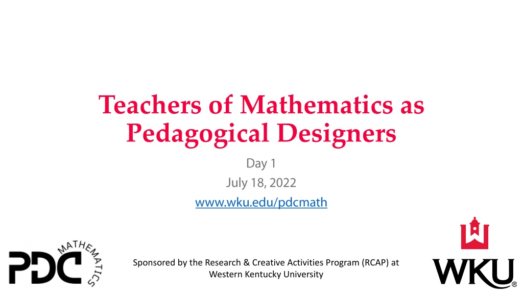Join the Teachers of Mathematics as Pedagogical Designers workshop sponsored by RCAP at Western Kentucky University. Explore various activities, discussions, and surveys focused on enhancing pedagogical design skills in mathematics teaching. Participate in icebreakers, surveys, and engaging sessions to expand your pedagogical knowledge. Fill out consent forms and engage in professional development opportunities.