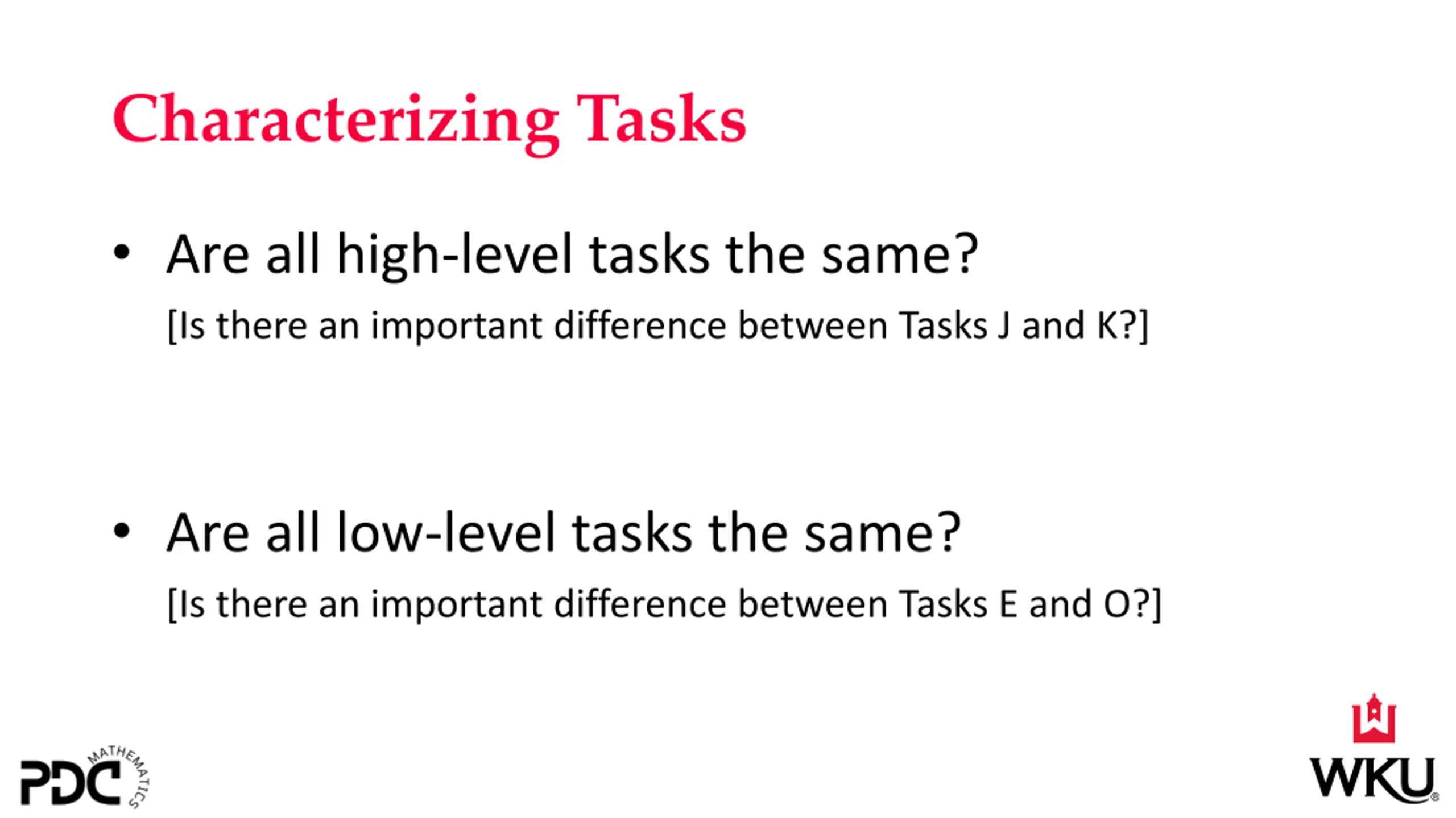 Characterizing Tasks Are all high-level tasks the same? [Is there an important difference between Tasks J and K?] Are all low-level tasks the same? [Is there an important difference between Tasks E and O?]