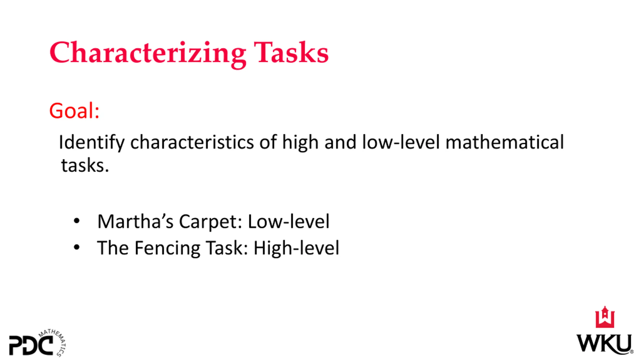 Characterizing Tasks Goal: Identify characteristics of high and low-level mathematical tasks. Martha s Carpet: Low-level The Fencing Task: High-level