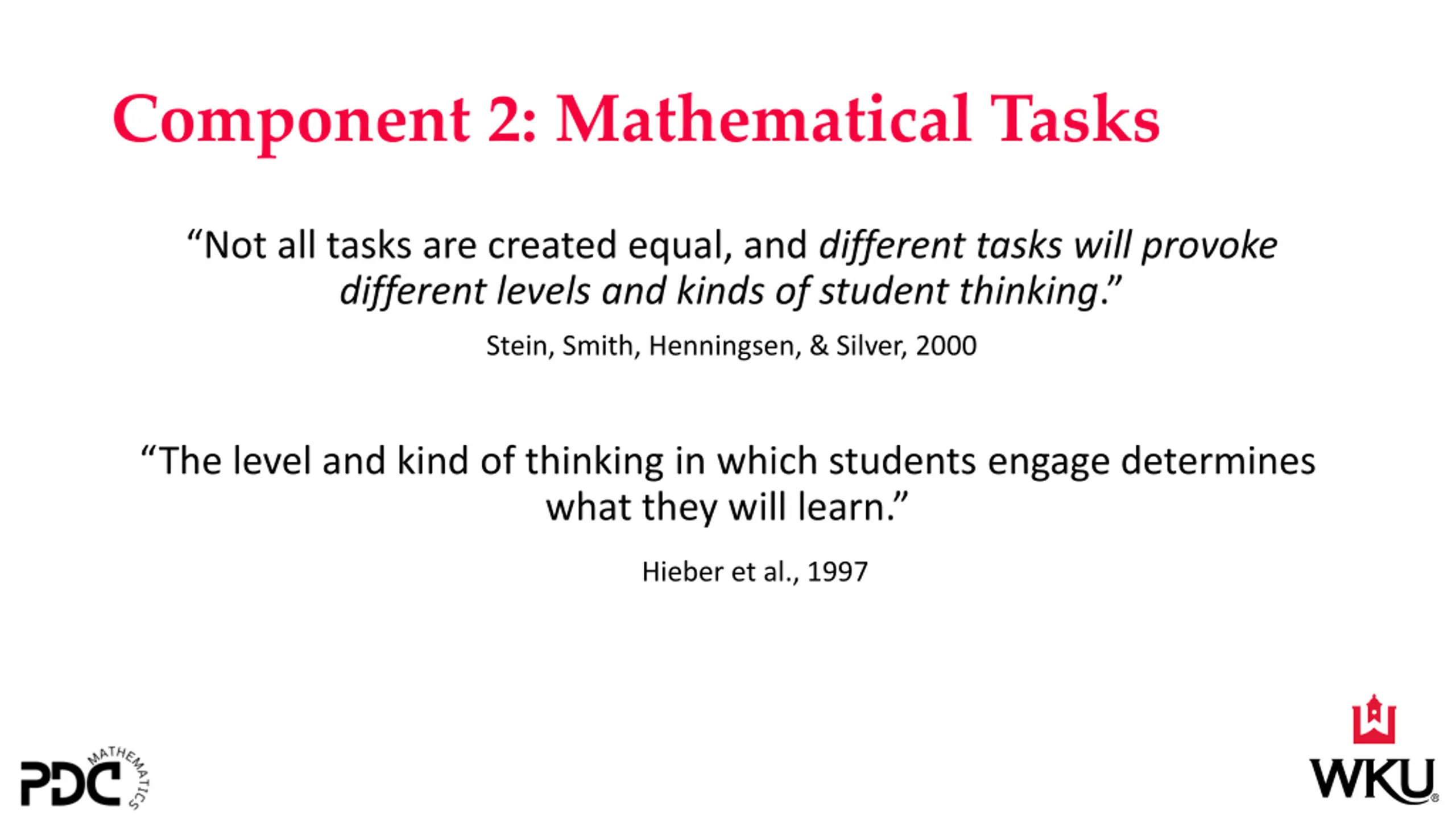 Component 2: Mathematical Tasks Not all tasks are created equal, and different tasks will provoke different levels and kinds of student thinking. Stein, Smith, Henningsen, & Silver, 2000 The level and kind of thinking in which students engage determines what they will learn. Hieber et al., 1997