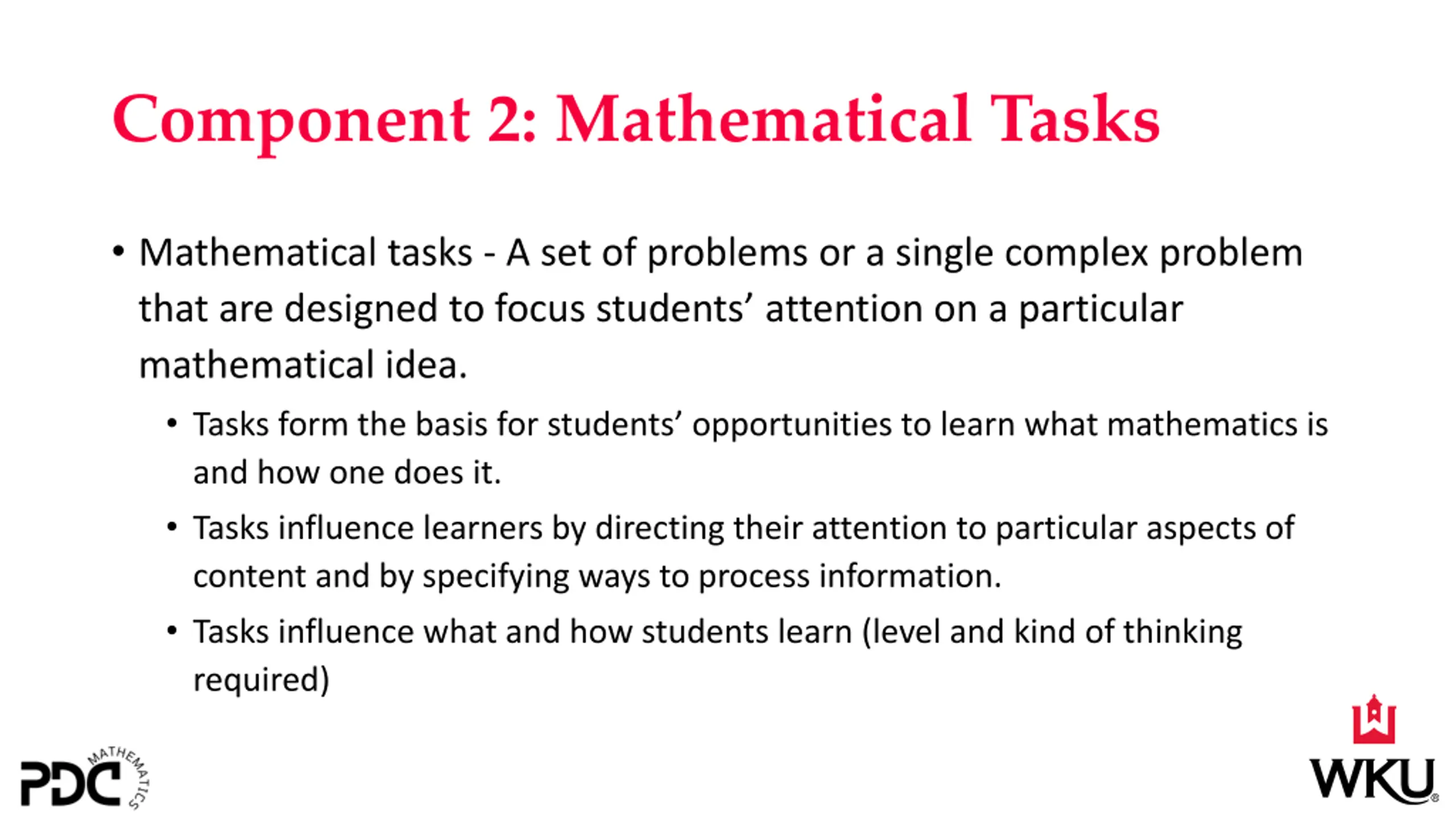 Component 2: Mathematical Tasks Mathematical tasks - A set of problems or a single complex problem that are designed to focus students attention on a particular mathematical idea. Tasks form the basis for students opportunities to learn what mathematics is and how one does it. Tasks influence learners by directing their attention to particular aspects of content and by specifying ways to process information. Tasks influence what and how students learn (level and kind of thinking required)