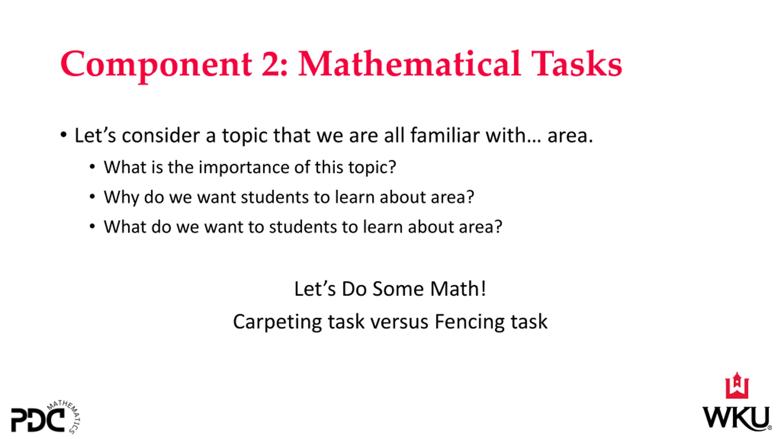 Component 2: Mathematical Tasks Let s consider a topic that we are all familiar with area. What is the importance of this topic? Why do we want students to learn about area? What do we want to students to learn about area? Let s Do Some Math! Carpeting task versus Fencing task