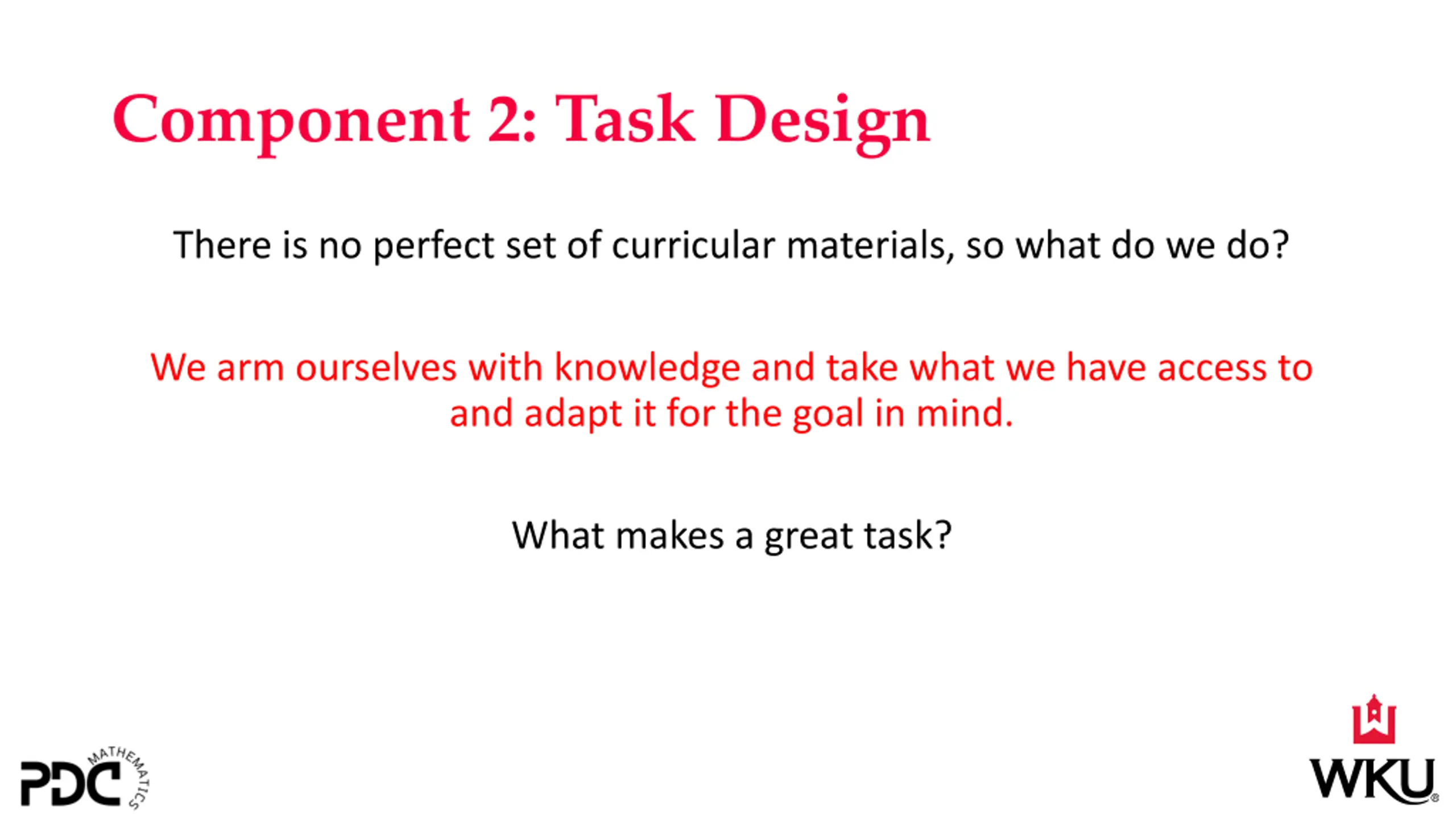 Component 2: Task Design There is no perfect set of curricular materials, so what do we do? We arm ourselves with knowledge and take what we have access to and adapt it for the goal in mind. What makes a great task?
