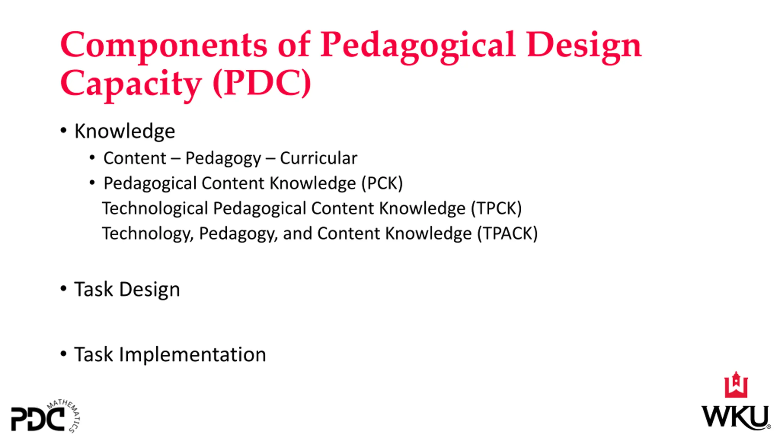 Components of Pedagogical Design Capacity (PDC) Knowledge Content Pedagogy Curricular Pedagogical Content Knowledge (PCK) Technological Pedagogical Content Knowledge (TPCK) Technology, Pedagogy, and Content Knowledge (TPACK) Task Design Task Implementation
