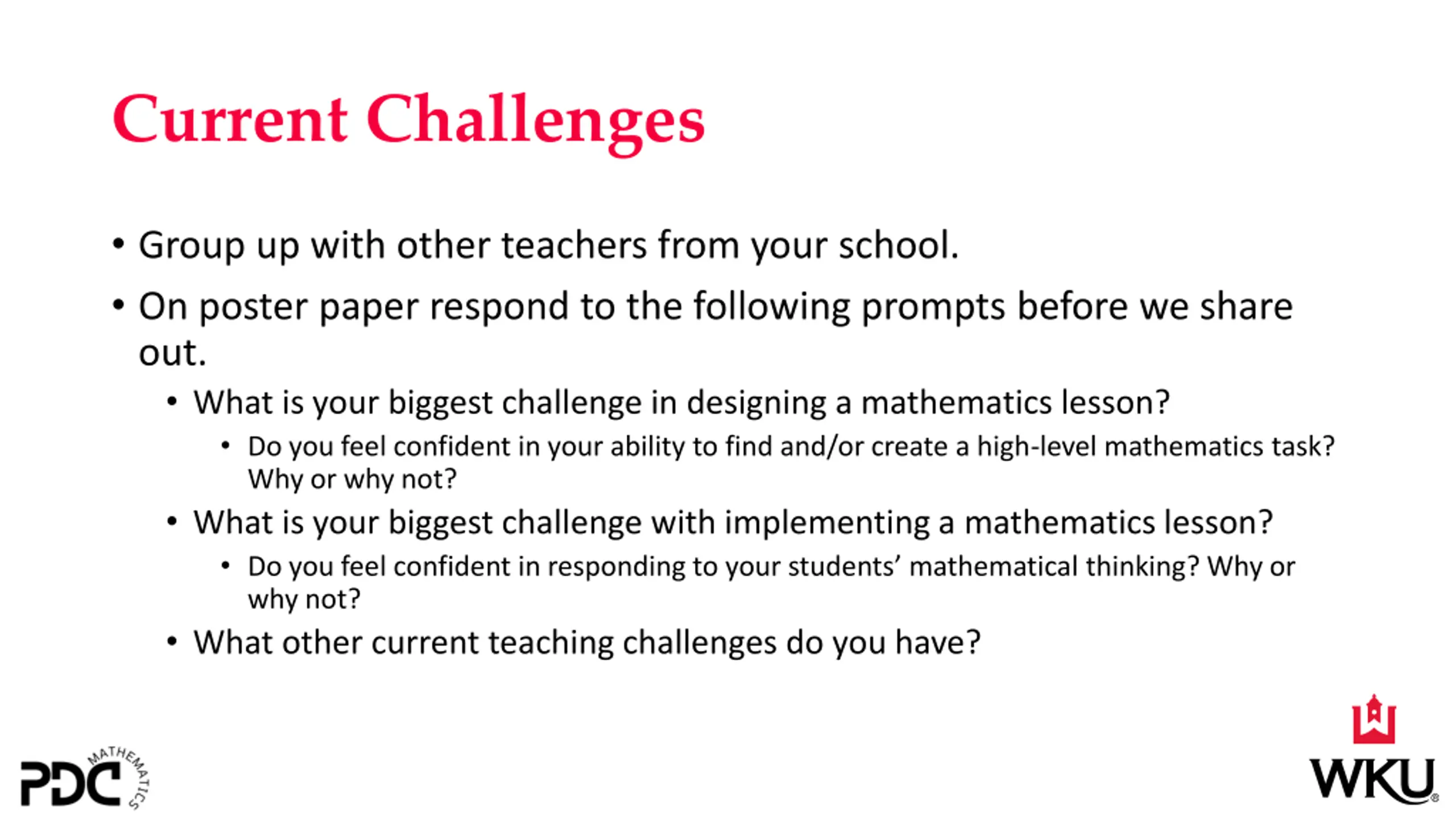 Current Challenges Group up with other teachers from your school. On poster paper respond to the following prompts before we share out. What is your biggest challenge in designing a mathematics lesson? Do you feel confident in your ability to find and/or create a high-level mathematics task? Why or why not? What is your biggest challenge with implementing a mathematics lesson? Do you feel confident in responding to your students mathematical thinking? Why or why not? What other current teaching challenges do you have?